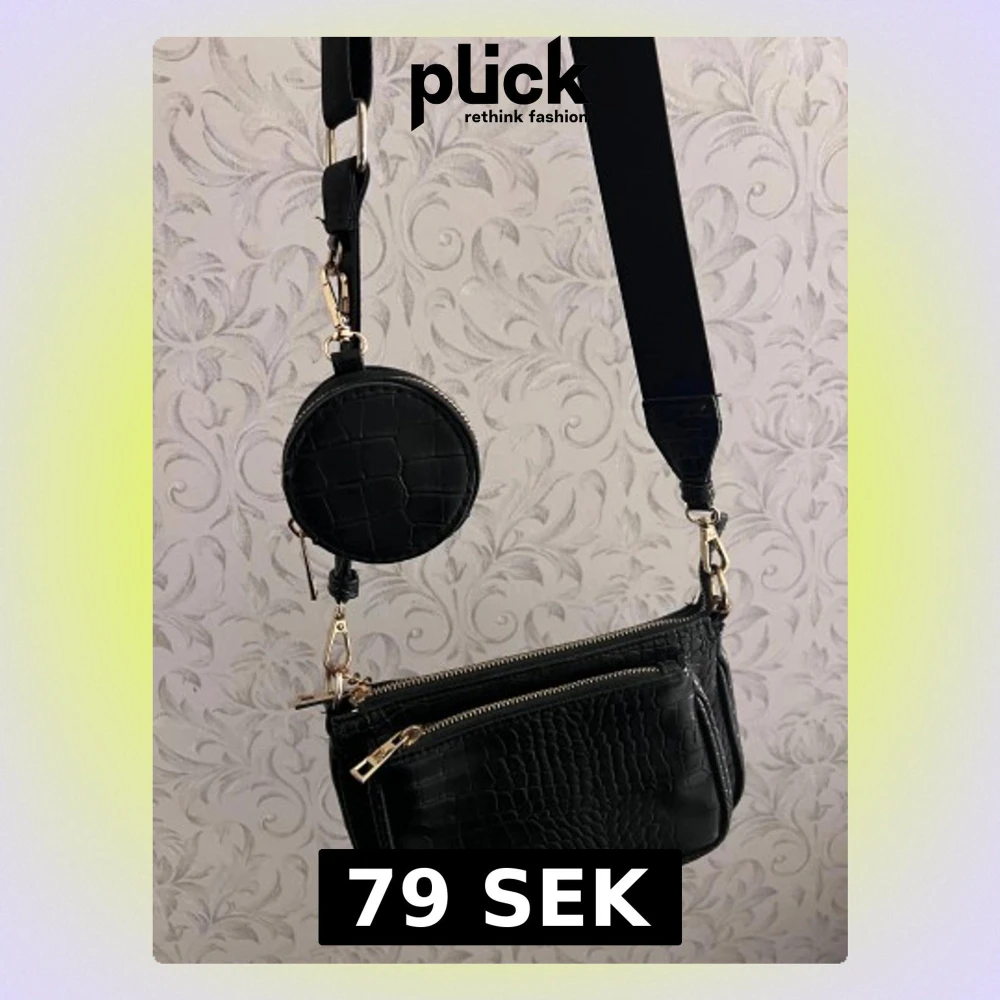 Snygg svart axelväska med croco-mönster och guldfärgade detaljer. Väskan har två fack med dragkedja och en rund liten coin pouch som hänger på den breda axelremmen. Hör av dig för frågor🩷