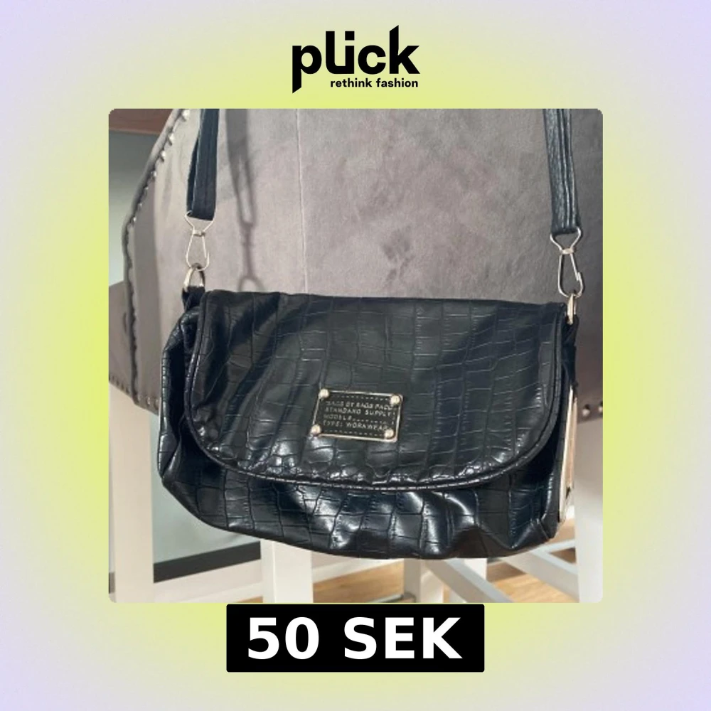 Snygg svart axelväska i croco-mönstrat skinnimitation med silverfärgade metalldetaljer och justerbar axelrem. Väskan har lock med magnetknäppning och ett mönstrat innerfoder med dragkedjefack. Perfekt för dig som vill ha en stilren och trendig väska.
