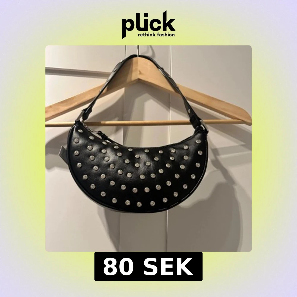 Snygg svart axelväska i syntetmaterial med diamanter. Väskan har en dragkedja upptill och en justerbar axelrem. Perfekt för att ge din outfit en edgy touch. Helt ny prislappen är fortfarande på den. Varumärket är Rita Ora X Primark. Jätte fin och bra skin väska. Perfekt för och cluba eller till någon fixad outfit.