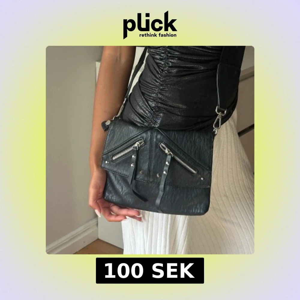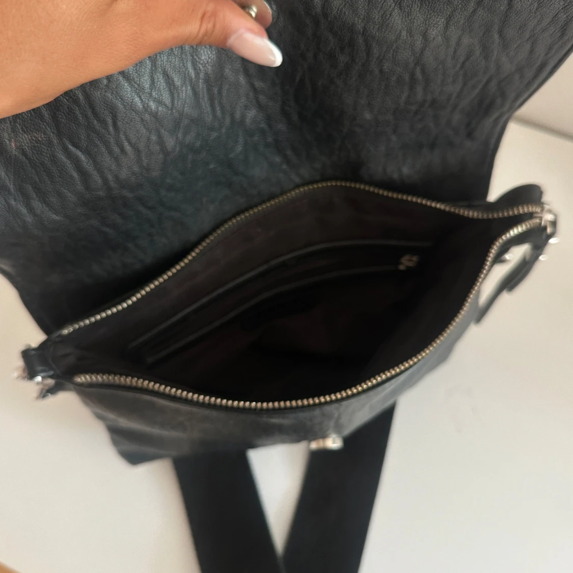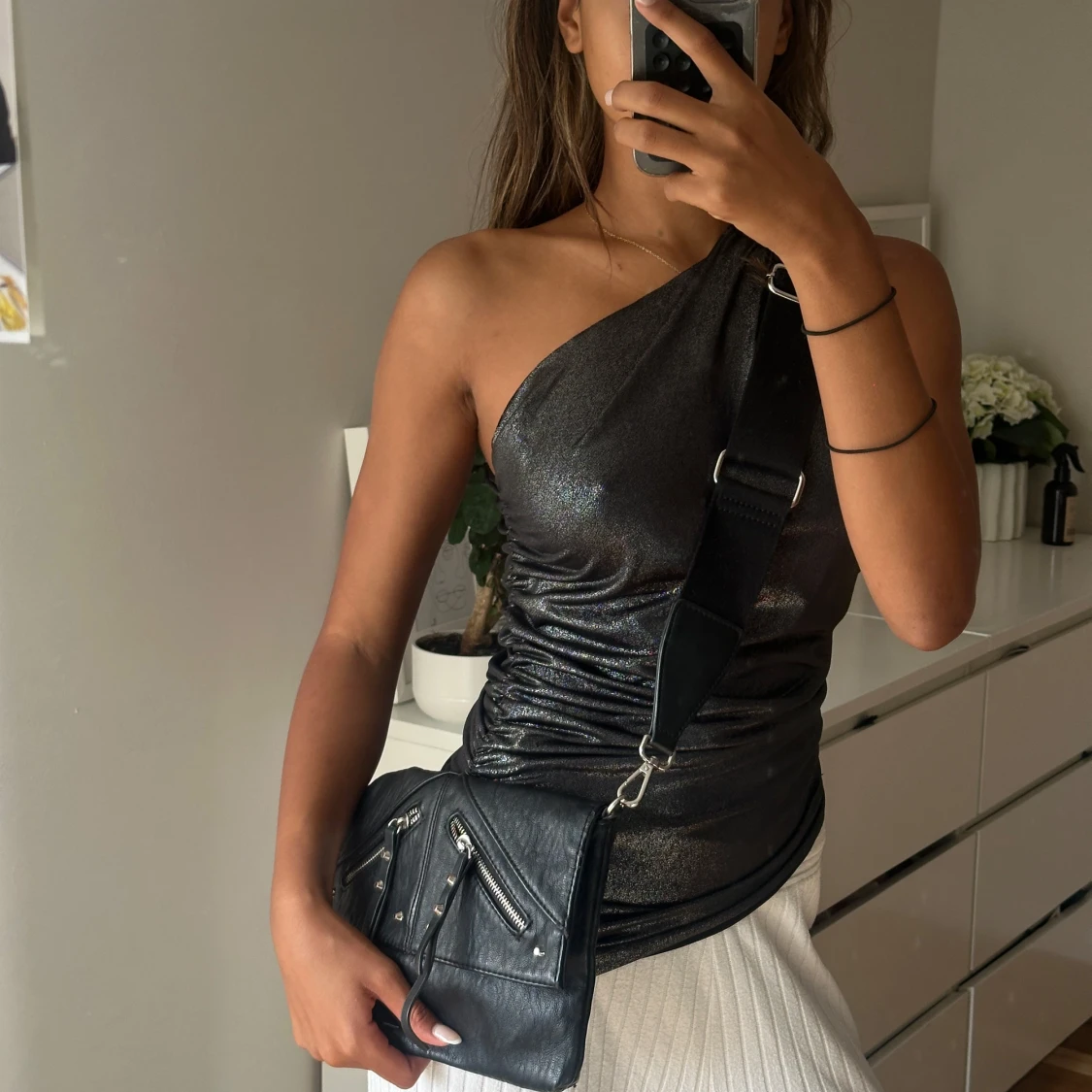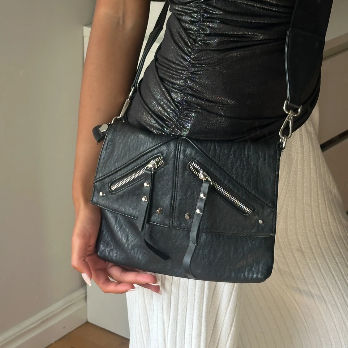 Cool svart axelväska i skinn med två sneda dragkedjor och dekorativa nitar på framsidan. Väskan har bred axelrem och ett rymligt huvudfack med extra innerficka. Perfekt för att bära dina essentials och ge din outfit en edgy vibe.