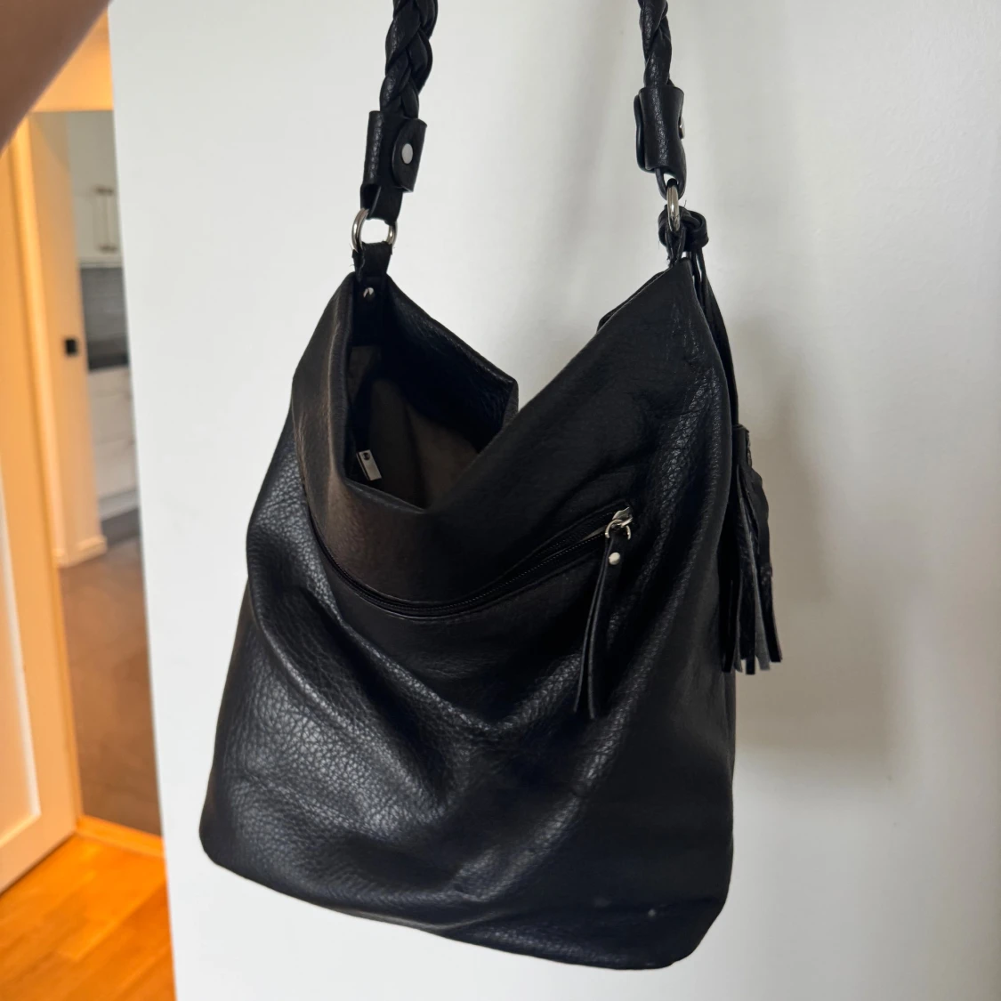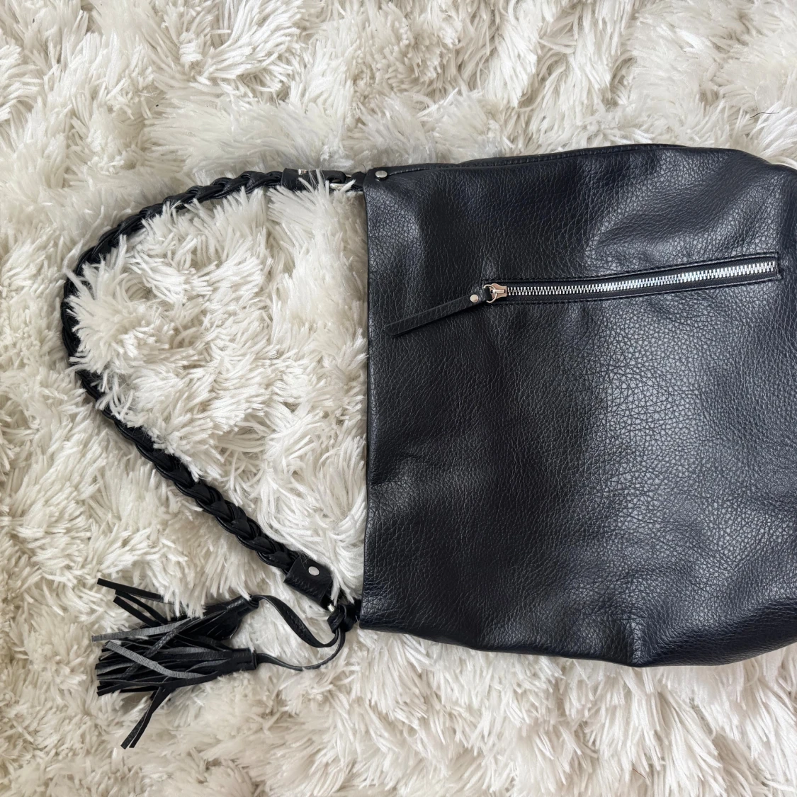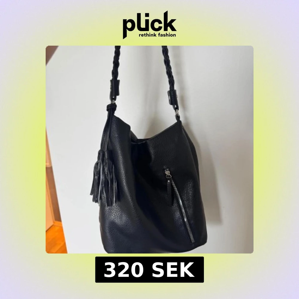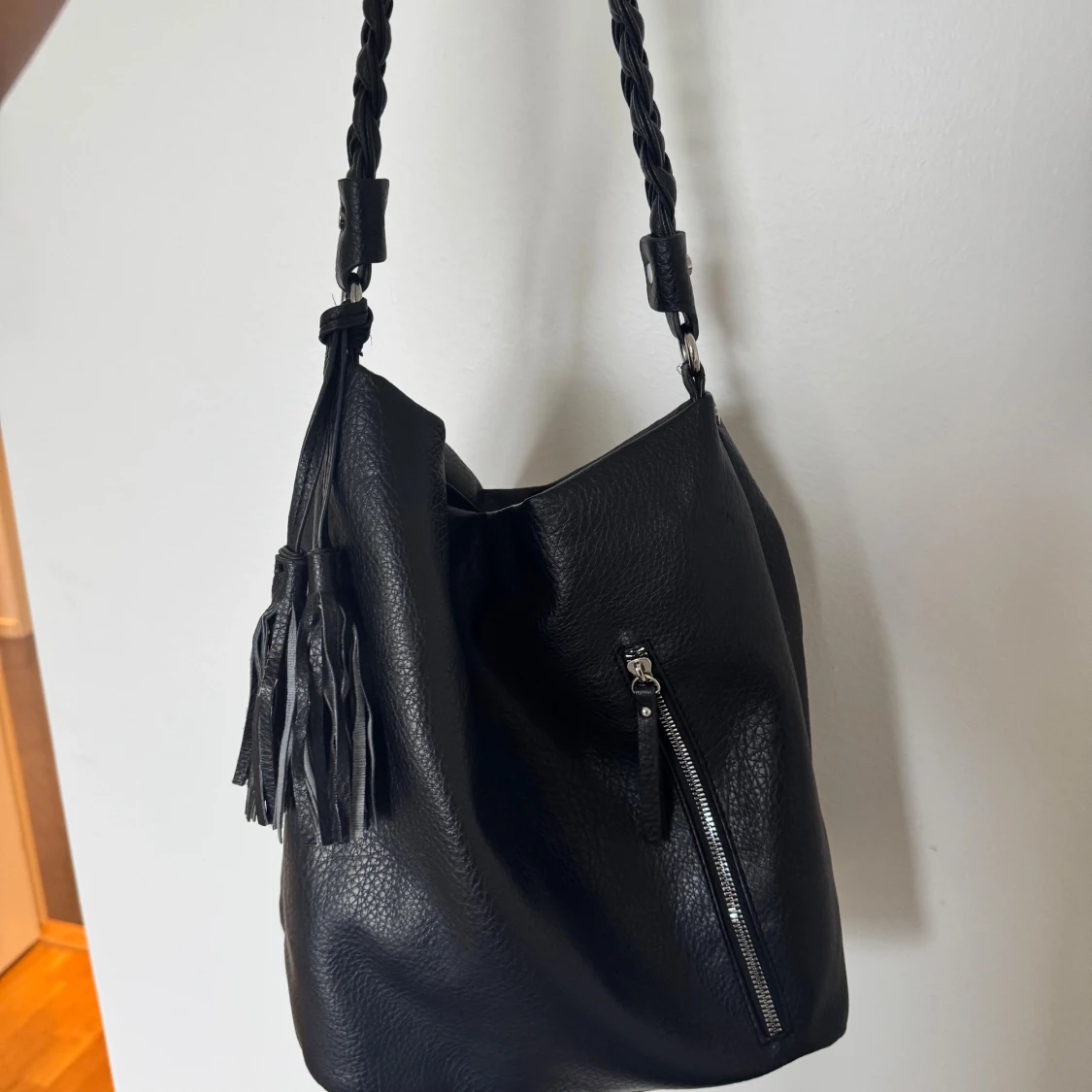 Svart snygg axelväska med en snygg frans detalj. Defekt på baksidan - lite slitage inget som syns när den bärs då det är på baksidan.