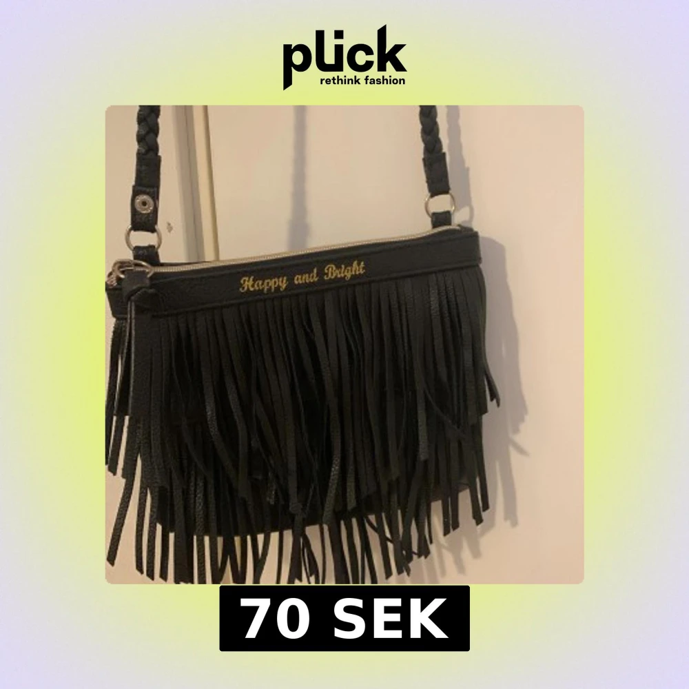 Cool svart axelväska med långa fransar och flätat axelband. Väskan har texten 'Happy and Bright' broderad i guld ovanför dragkedjan. Insidan är fodrad i ljusrosa tyg. Perfekt för dig som vill sticka ut lite extra.