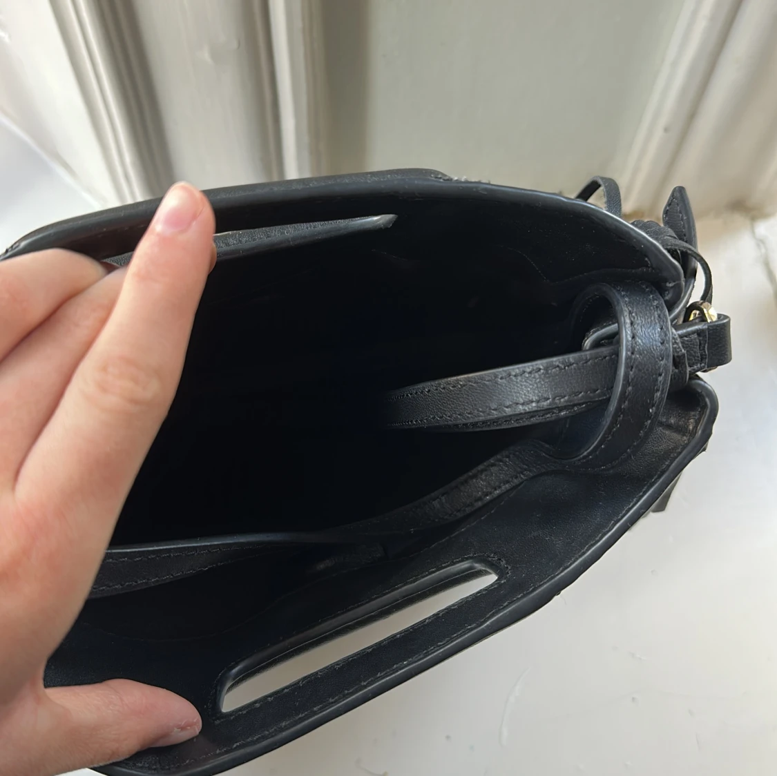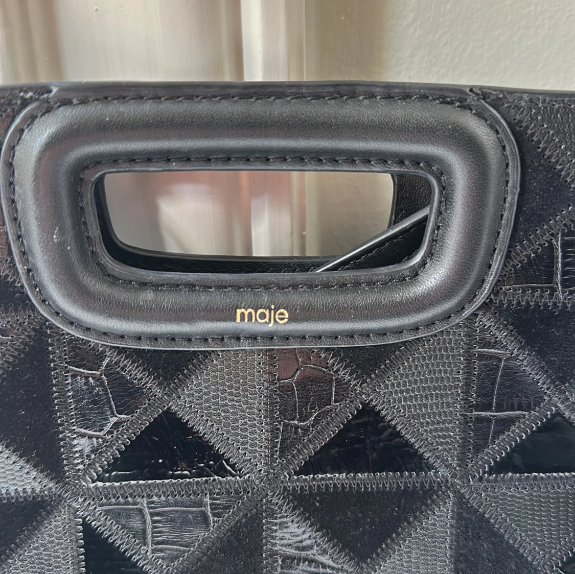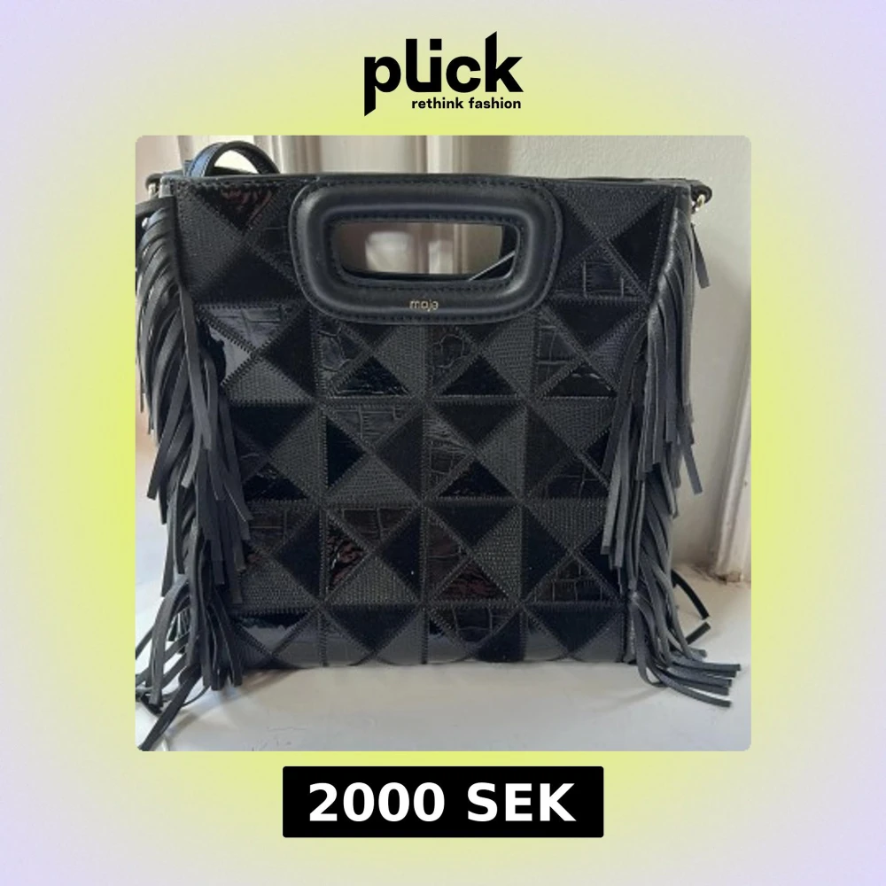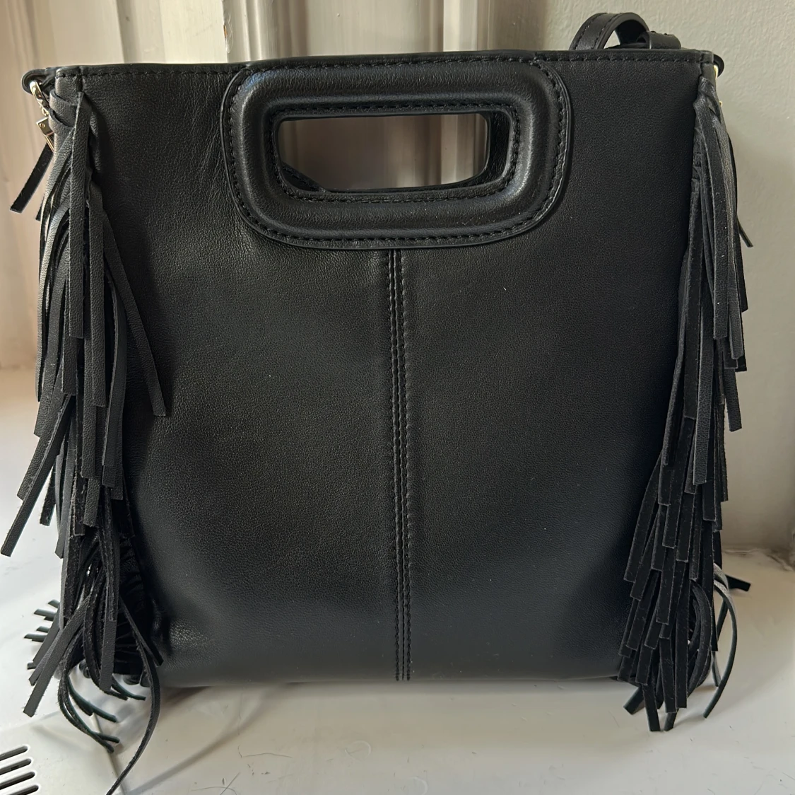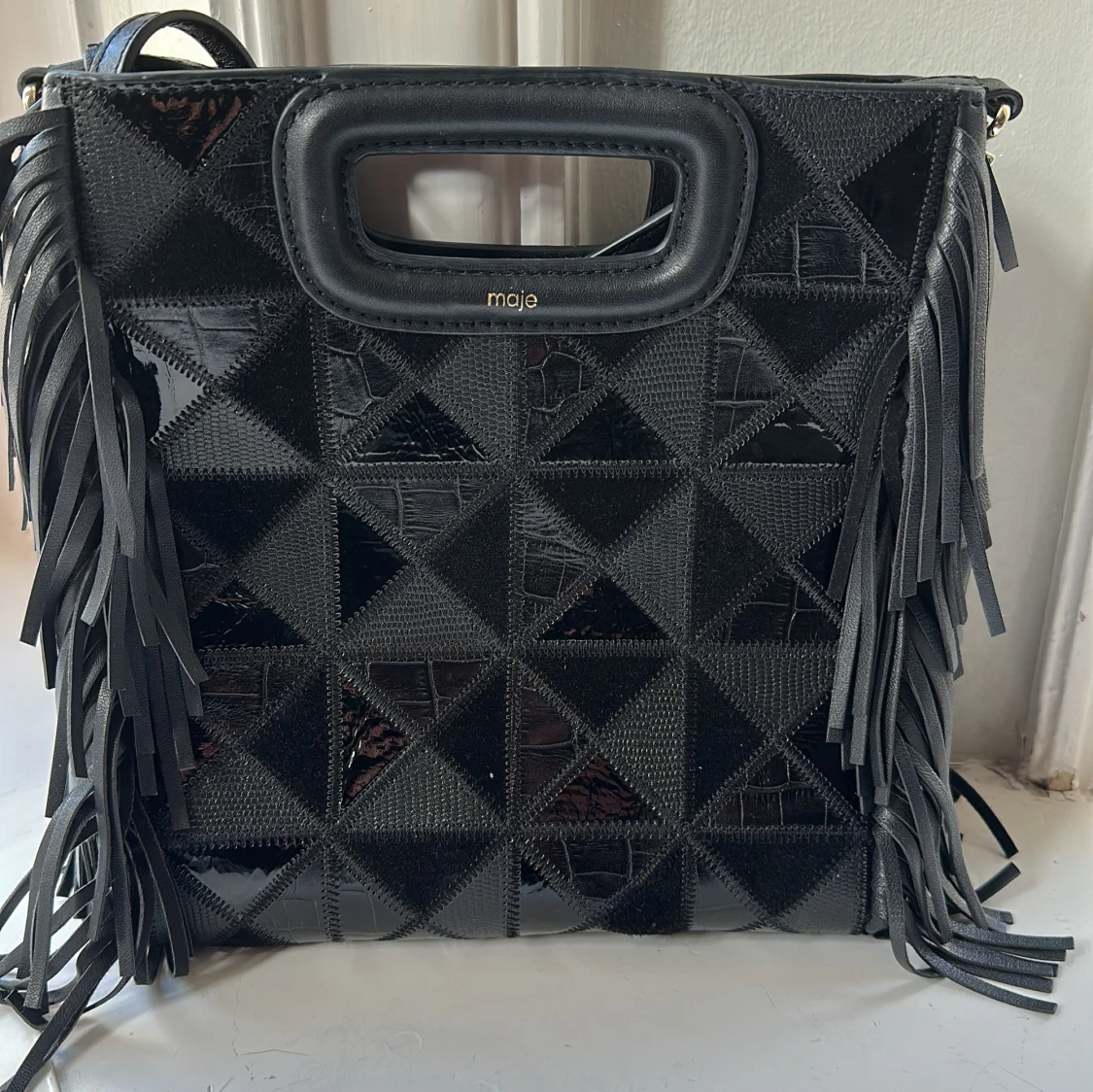 Säljer en svart axelväska från Maje med coola fransar på sidorna och geometriskt mönstrad framsida i olika texturer. Väskan har inbyggda handtag och axelrem, tillverkad i skinn. Perfekt för dig som vill sticka ut med en unik accessoar. Aldrig använd, och köpt på NK