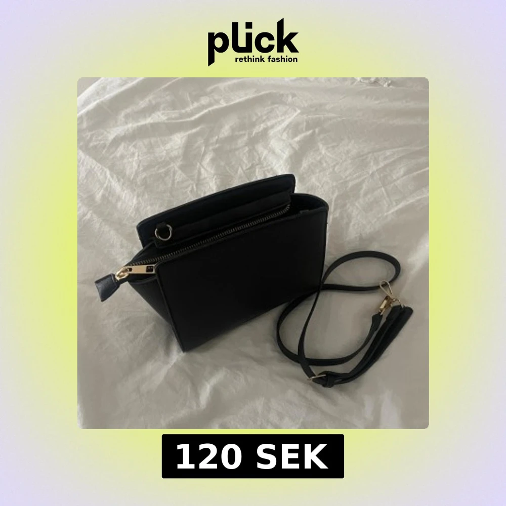 Stilren svart axelväska med avtagbar rem och snygga guldfärgade detaljer. Väskan har en rektangulär form och praktisk dragkedja upptill. Perfekt storlek för mobil, plånbok och andra essentials. Materialet är slätt och känns lyxigt.