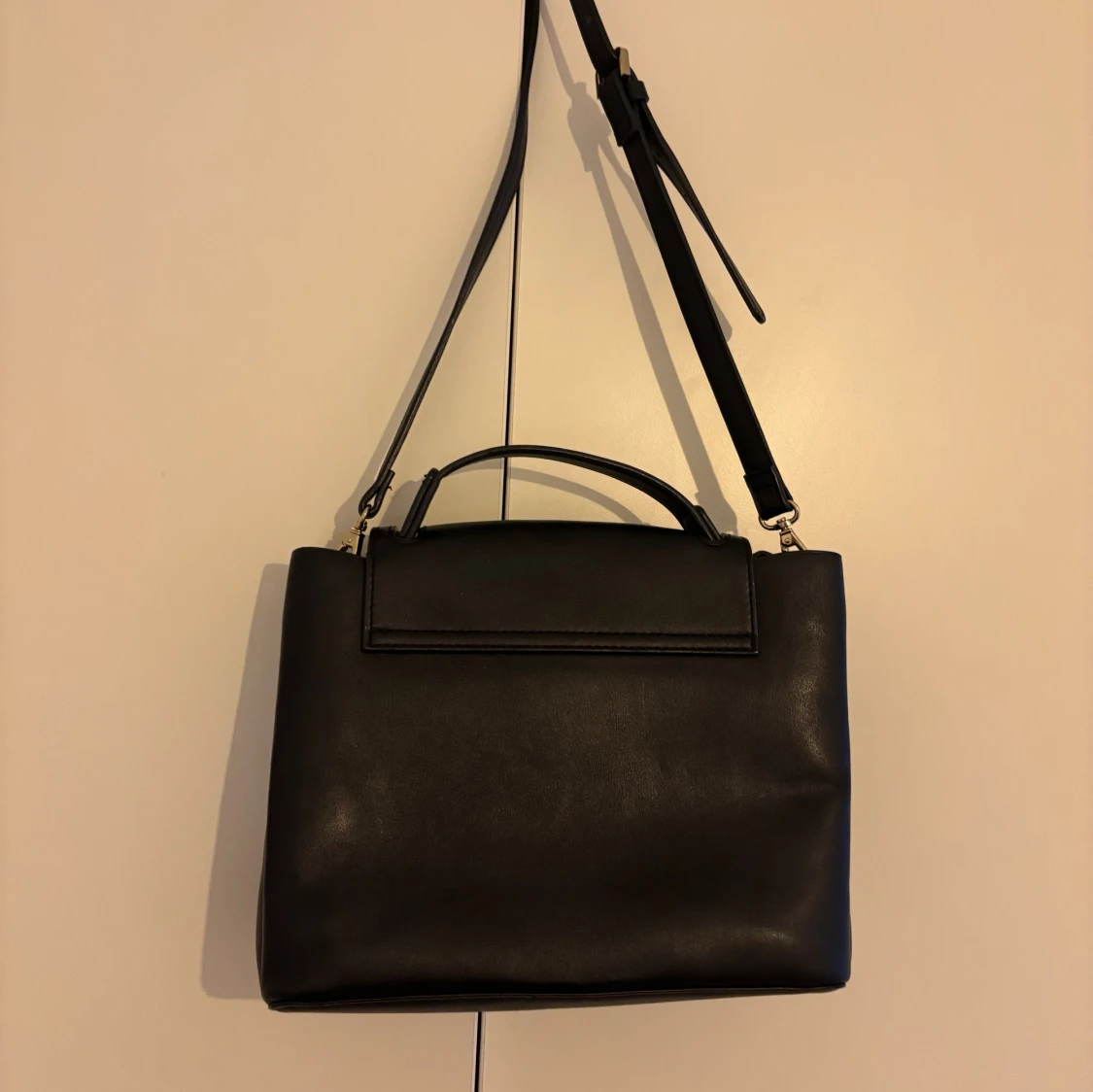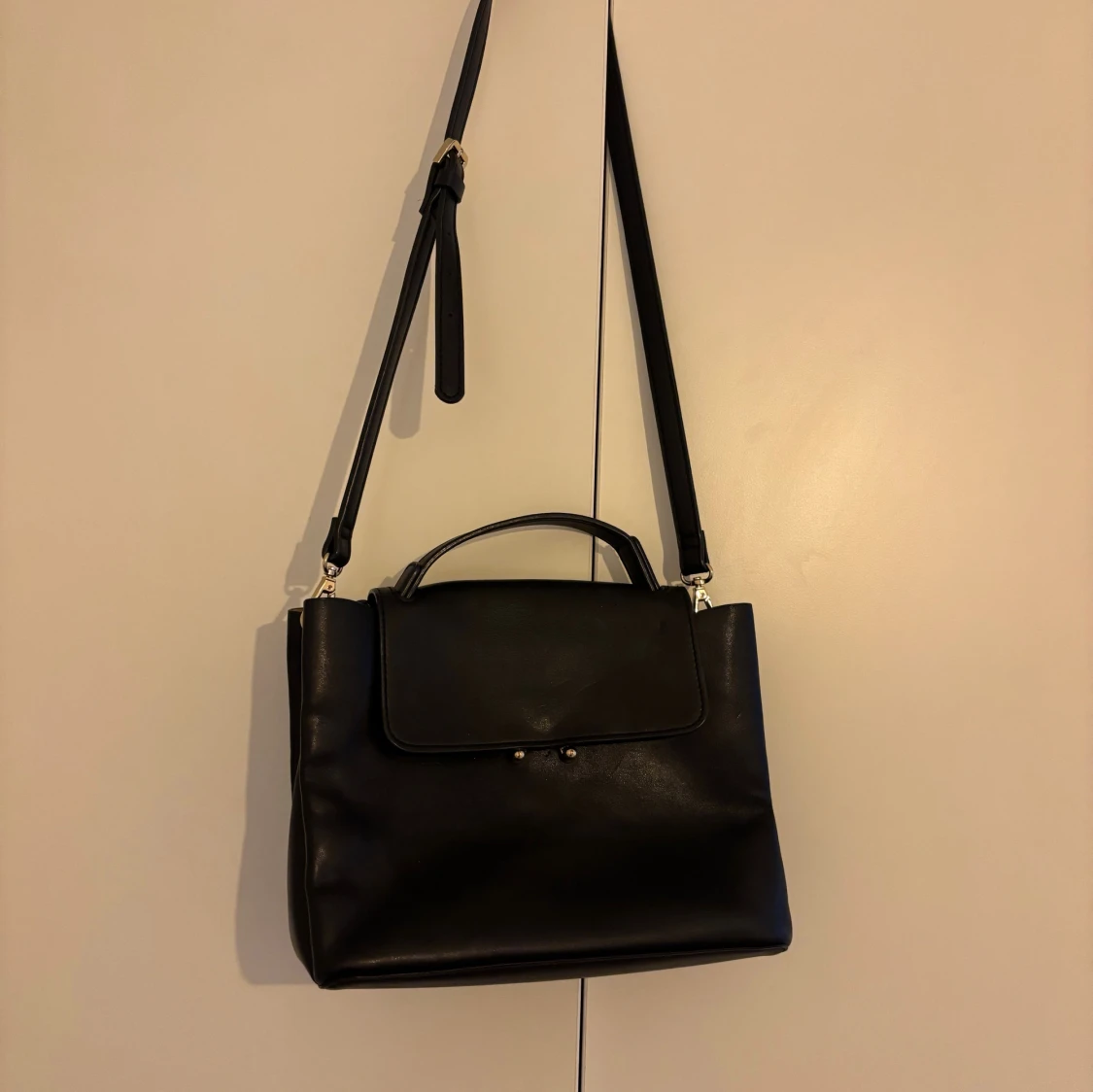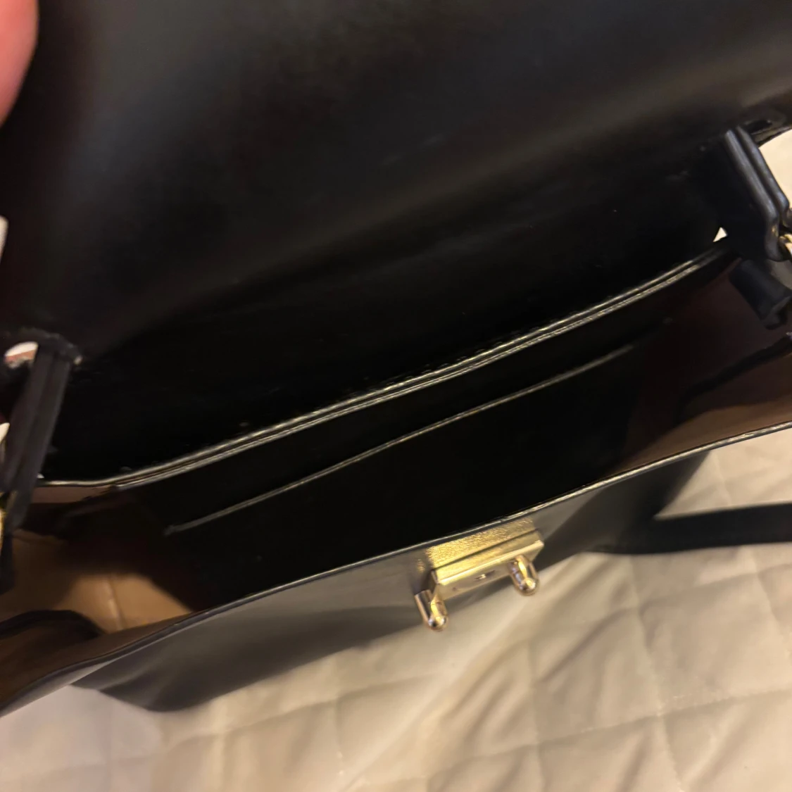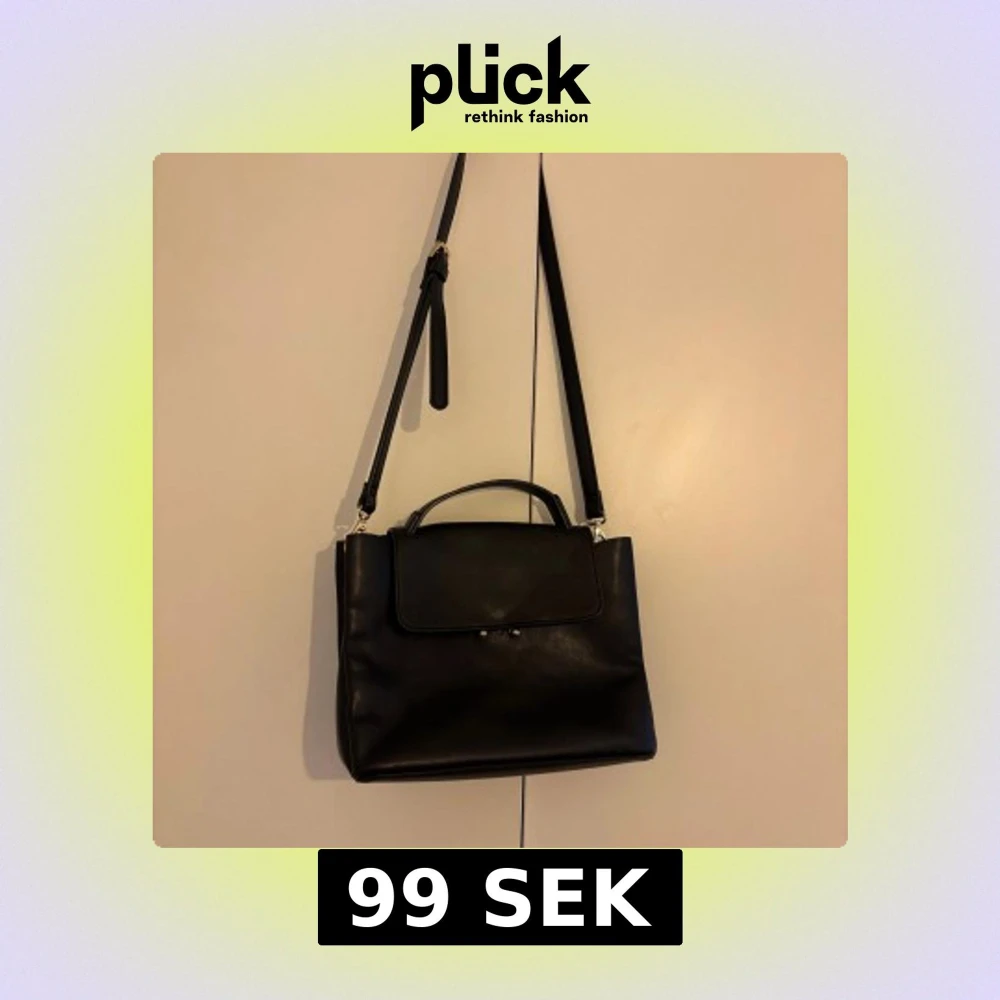 Stilren svart axelväska i skinnimitation med justerbar axelrem och praktiskt handtag. Väskan har ett lock med guldfärgad stängning och flera fack inuti för bra organisering. Perfekt storlek för att få plats med allt du behöver och passar till många olika outfits. Står inte vart den kommer ifrån och fick den som present så är inte säker.