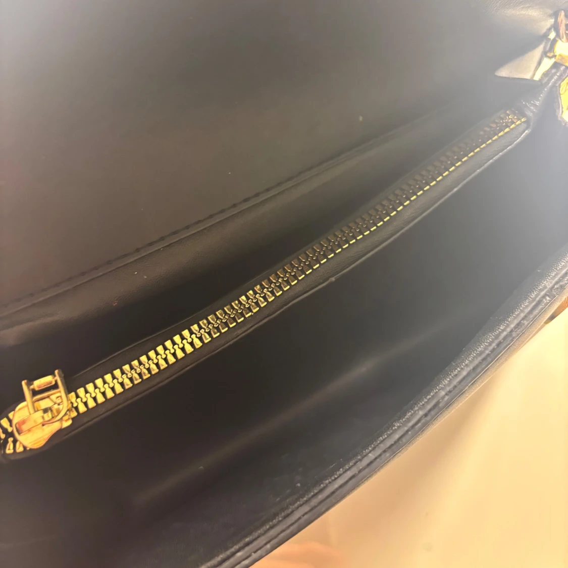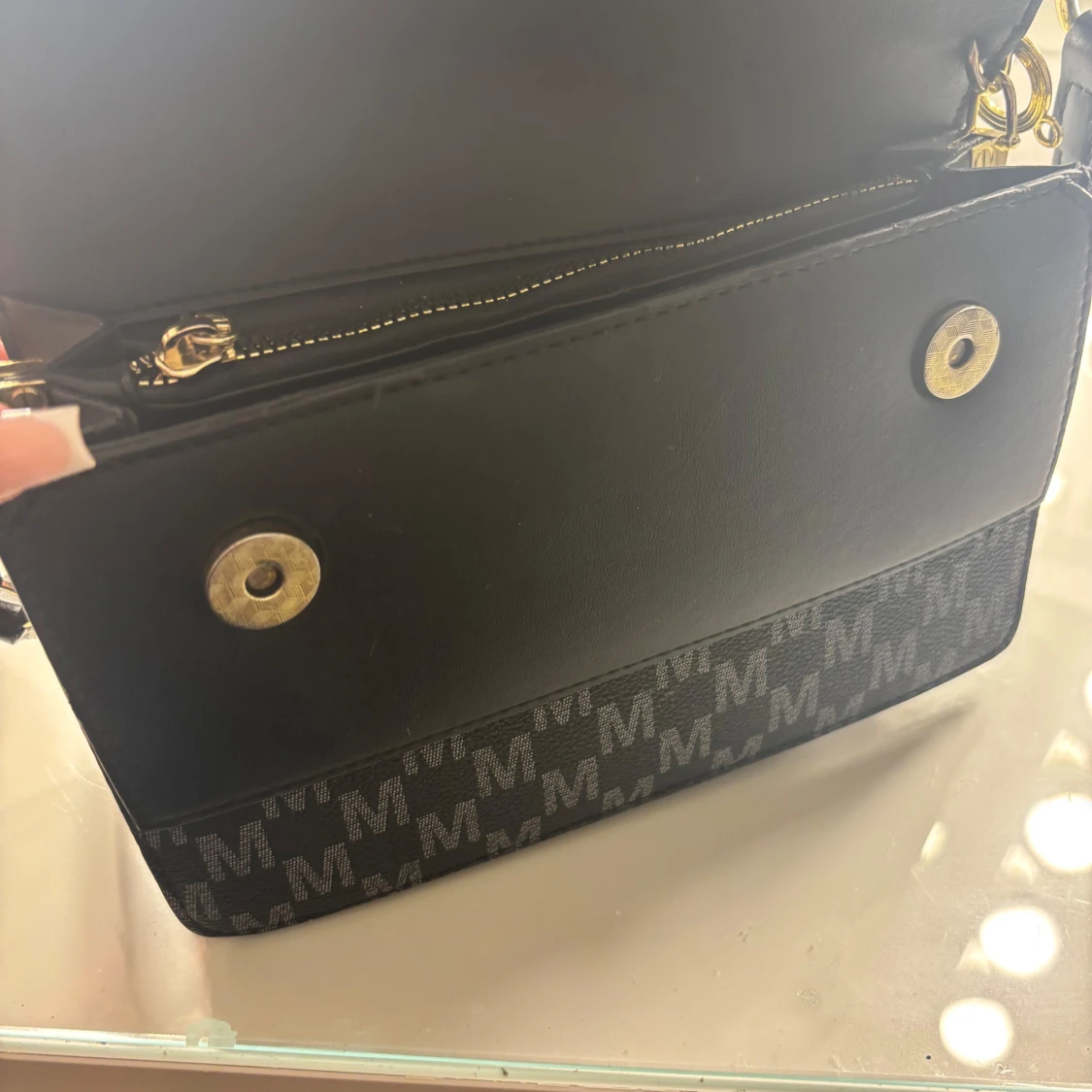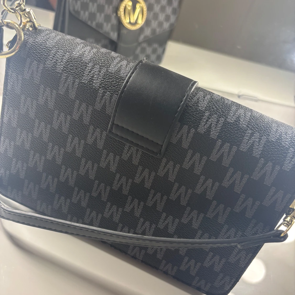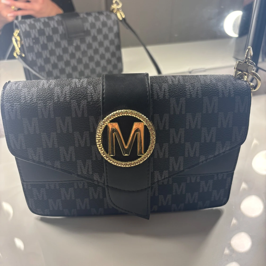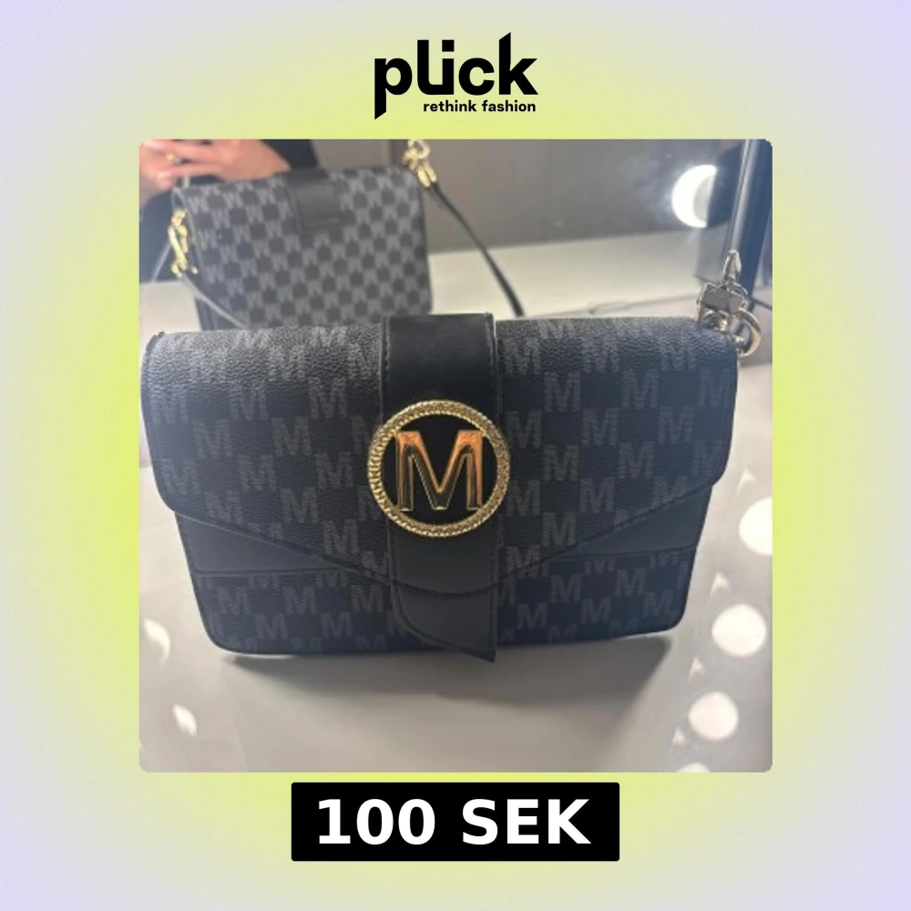Snygg svart axelväska från Marella med mönster av grå M-loggor över hela väskan. Väskan har ett stort guldfärgat M-spänne framtill, justerbar axelrem och dragkedja inuti.