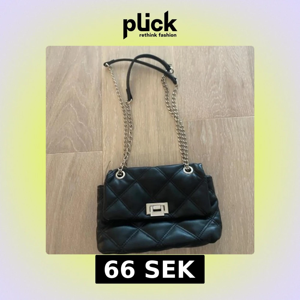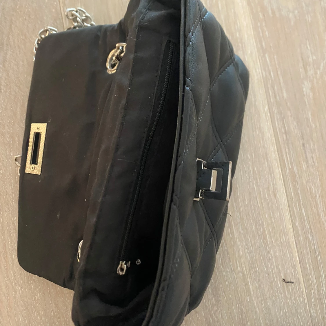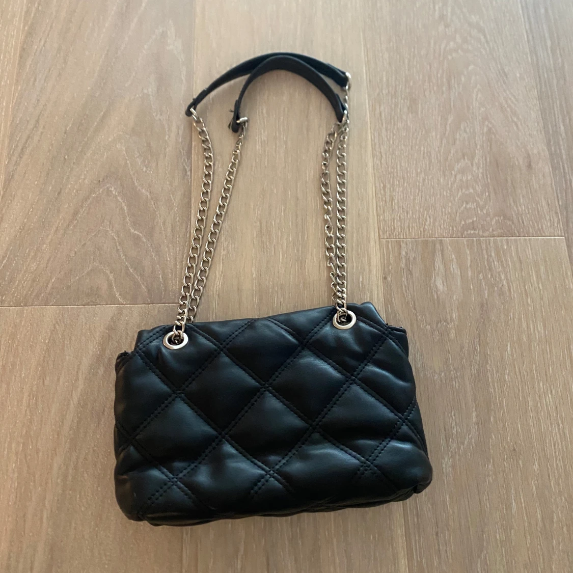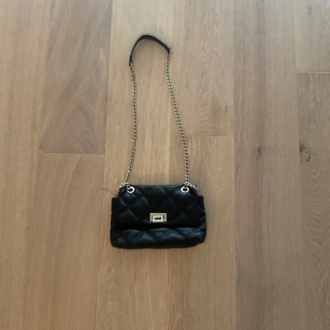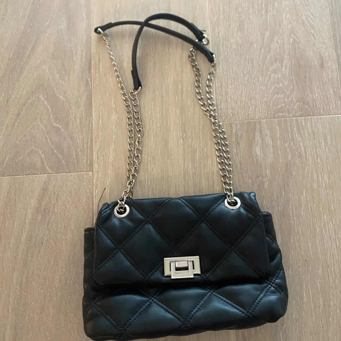 Säljer en svart axelväska med silverfärgad kedjerem och snyggt spänne. Insidan har dragkedja för extra säkerhet. Stilren och enkel att matcha.