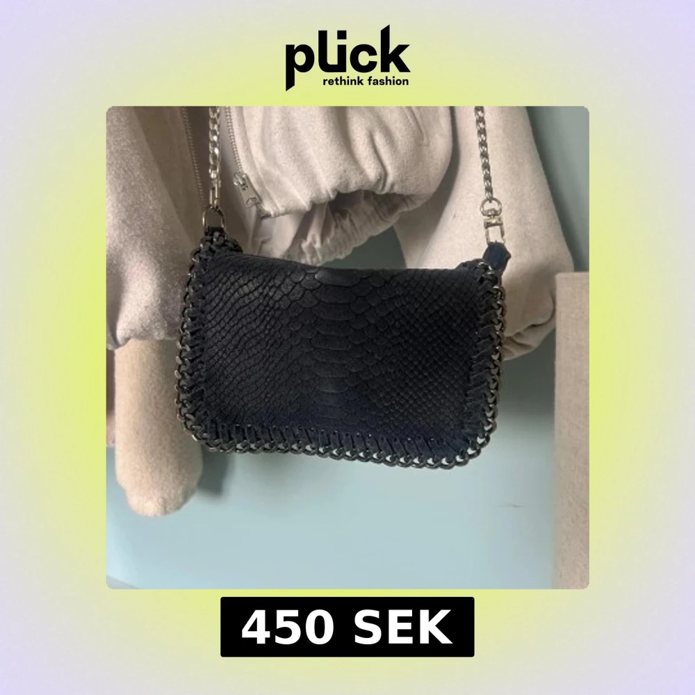 Snygg blå axelväska med kedjerem och coolt ormskinnsmönster. Väskan har en rektangulär form och detaljer i metall runt kanterna som ger en edgy vibe. Perfekt storlek för det viktigaste och passar till många olika outfits.