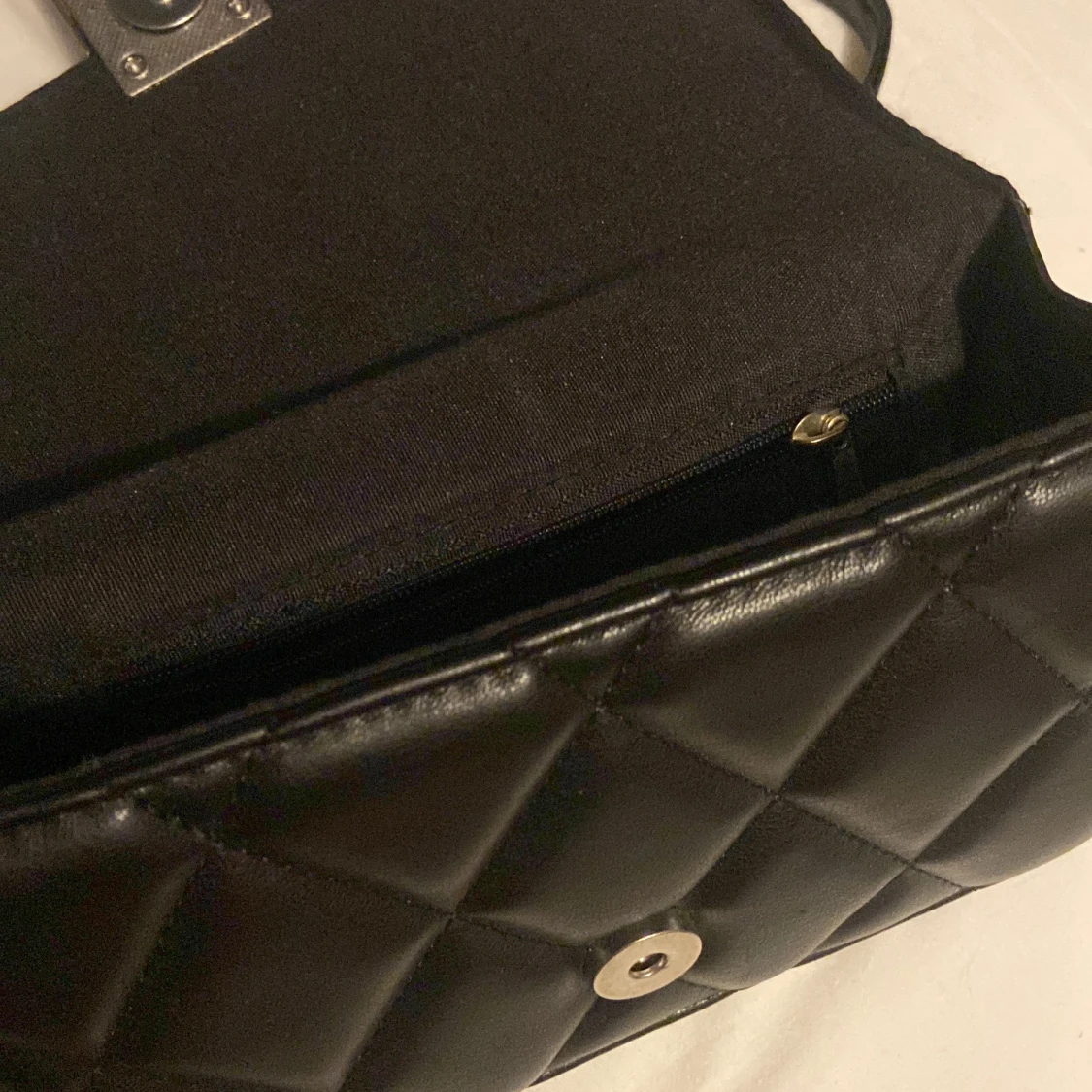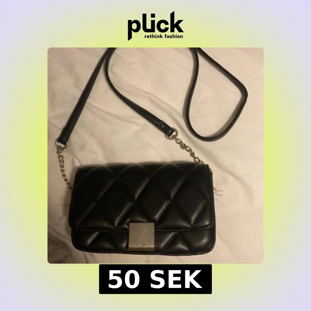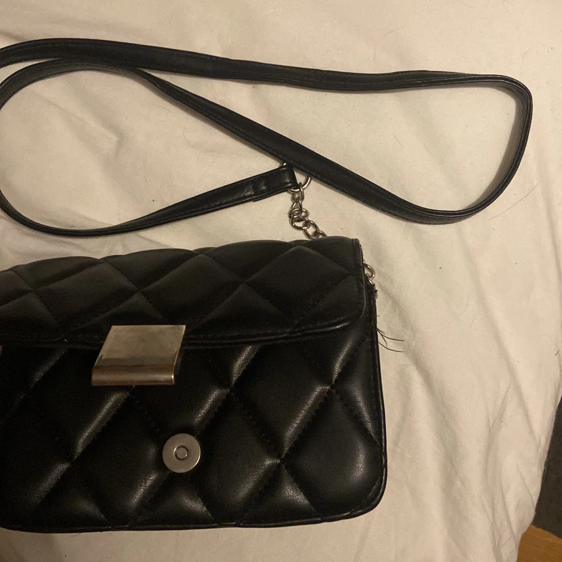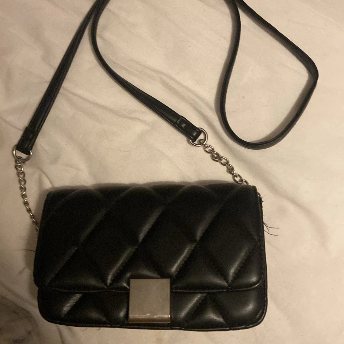 Snygg svart axelväska med silverfärgad kedja Väskan har ett innerfack med dragkedja och lång axelrem i både skinnimitation och kedja. Perfekt storlek för det viktigaste