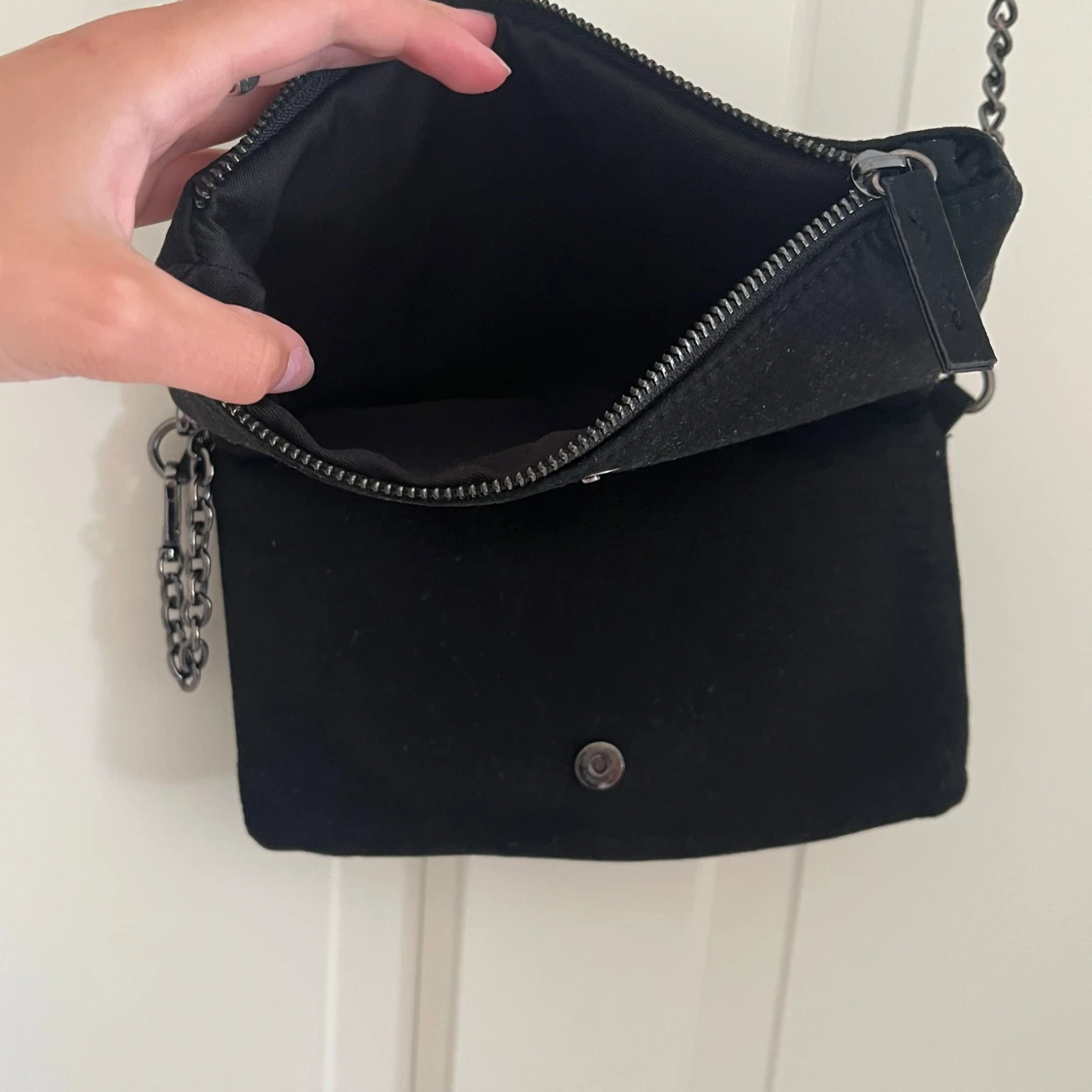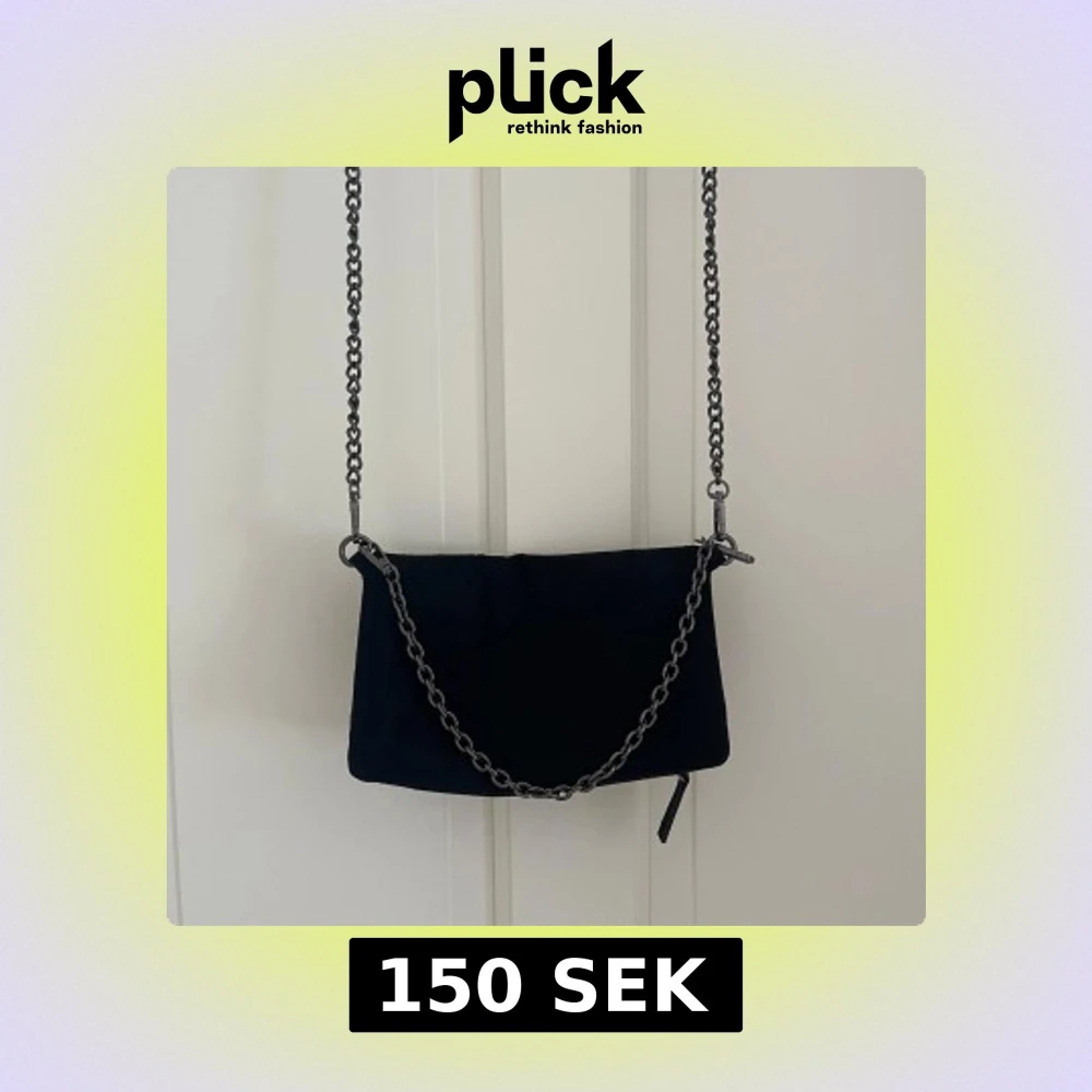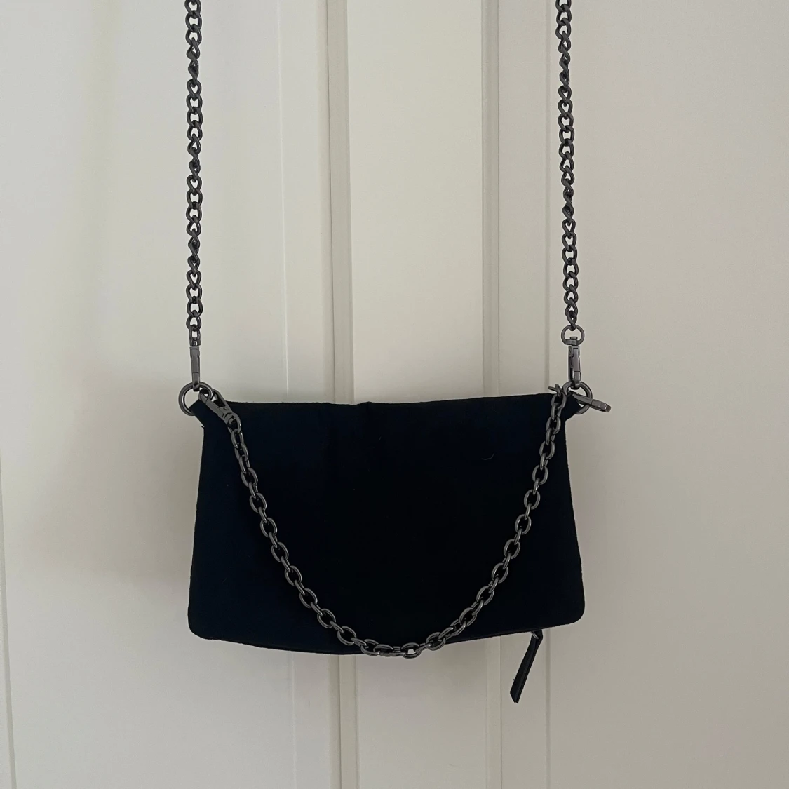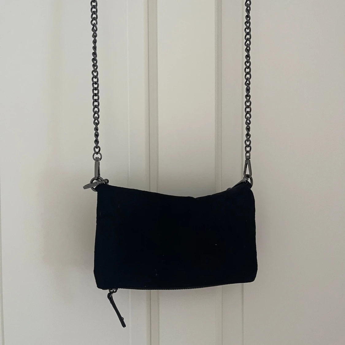 Snygg svart axelväska i mjukt tyg med coola metallkedjor som axelrem och handtag. Väskan har dragkedja upptill och en enkel, stilren design som passar till det mesta. Perfekt storlek för mobil, plånbok och nycklar. Väskan är från mango kids och köpt på Zalando .Öppen för prisförslag