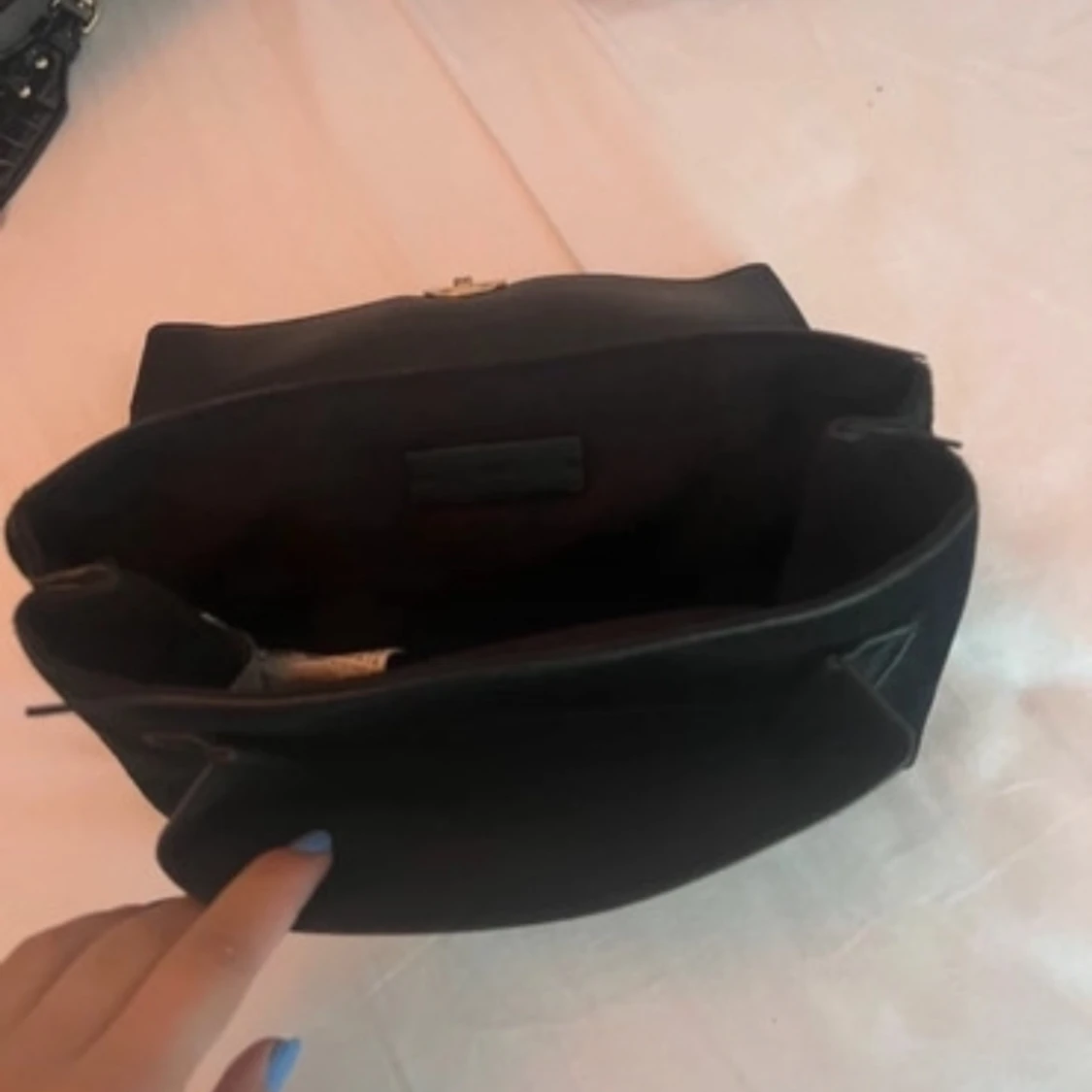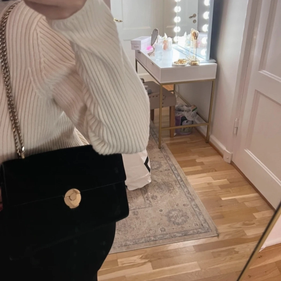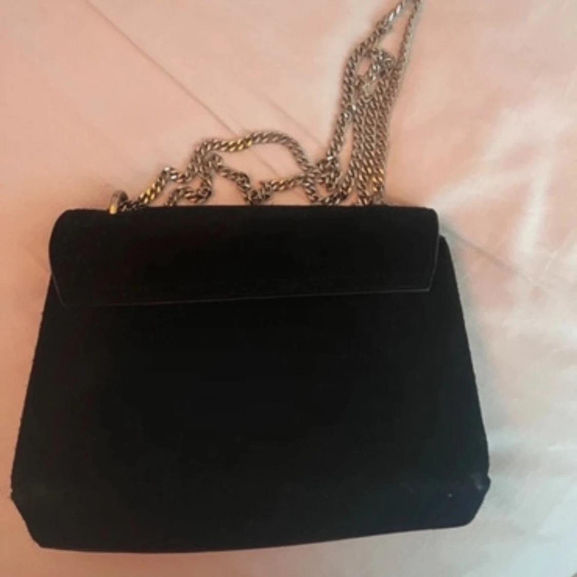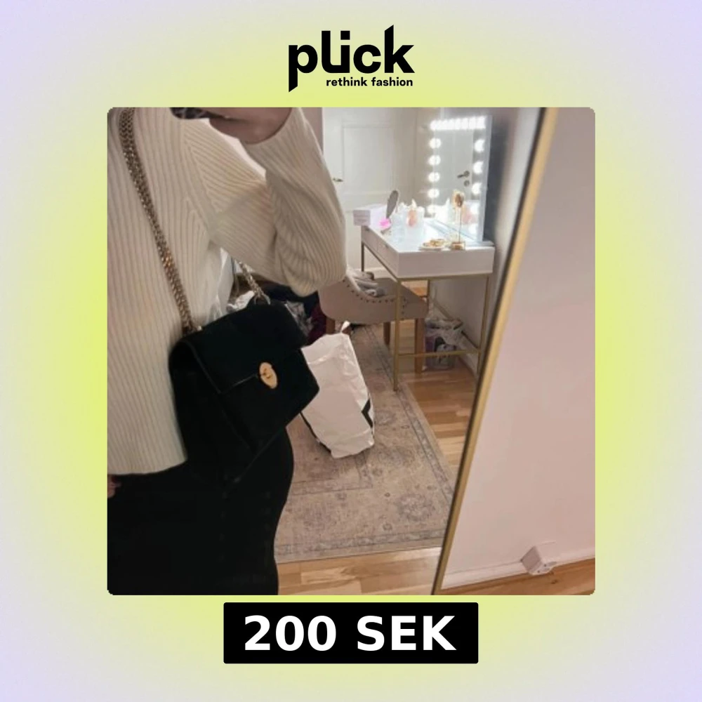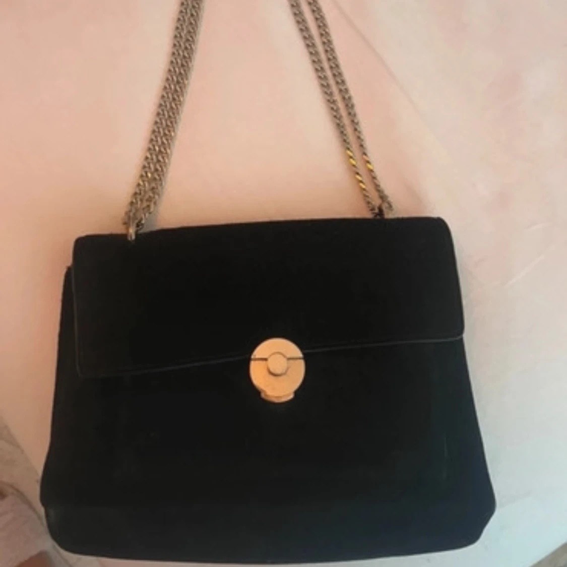 Snygg svart axelväska i sammet med guldfärgad kedja och rund låsdetalj. Perfekt för att ge en elegant touch till din outfit. Väskan har ett rymligt fack och en stilren design.