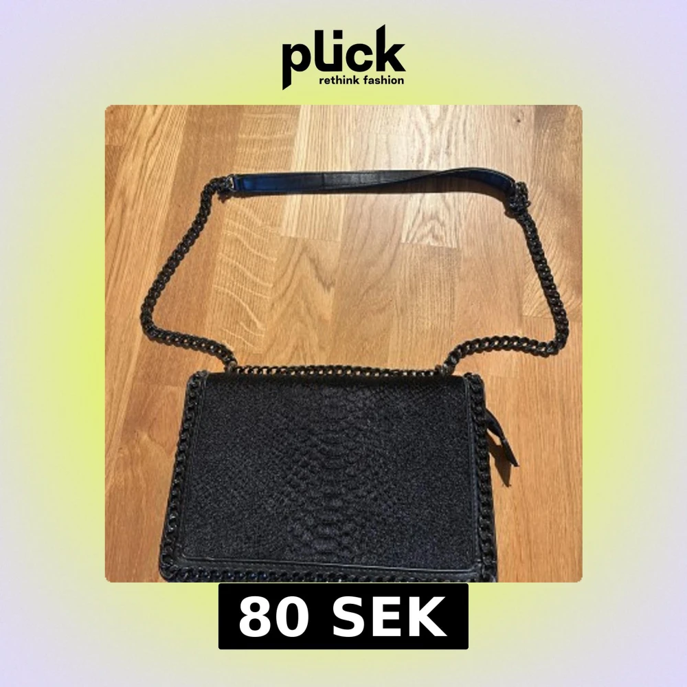 Snygg svart axelväska med kedjerem och detaljerad framsida med reptilmönster. Väskan har flera fack, dragkedja på baksidan och röd insida som ger en cool kontrast. Perfekt storlek för det viktigaste och stilren look.