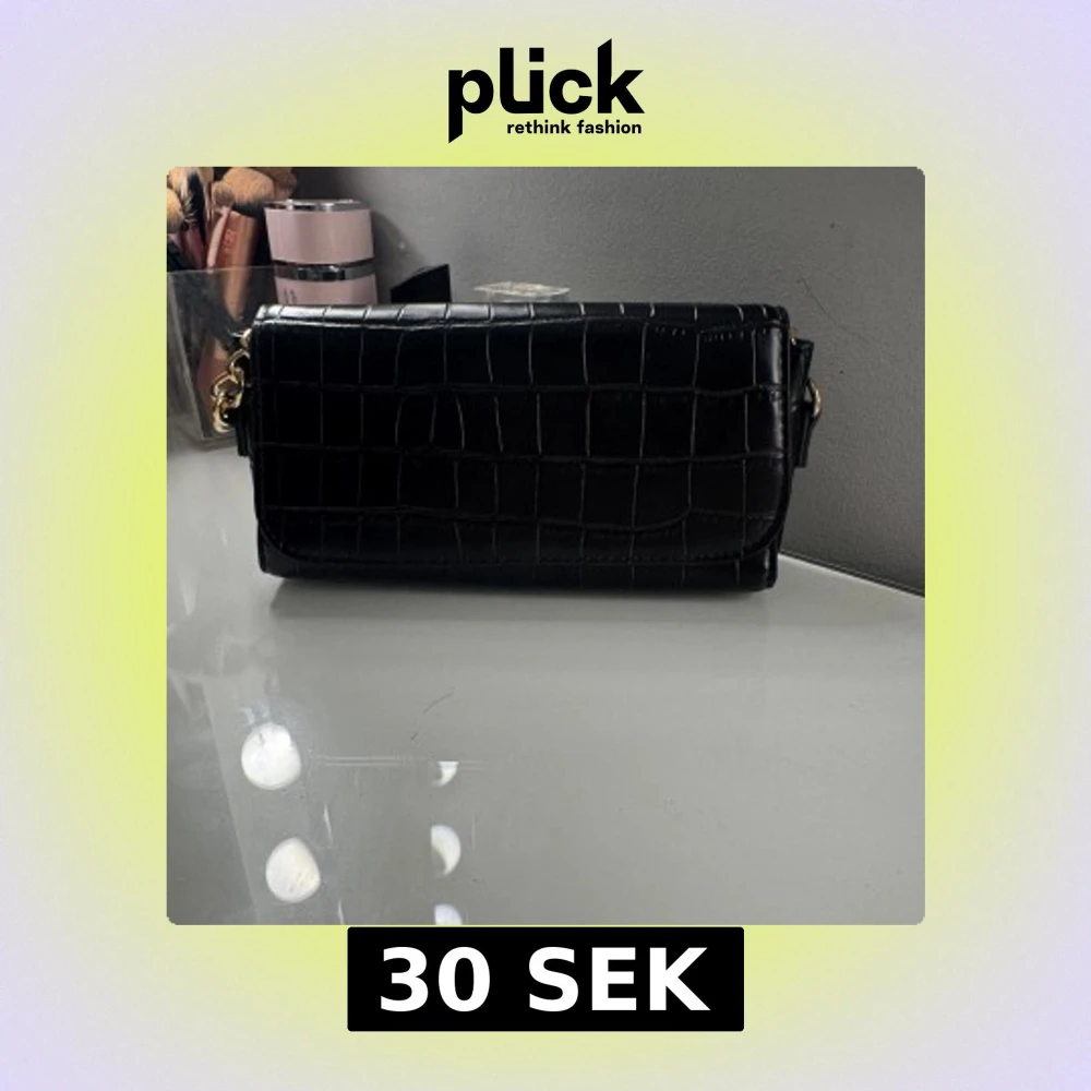 Snygg svart axelväska i croco-mönstrat skinnimitation med guldig kedjerem. Väskan har en rektangulär form och stängs med lock. Går även att lägga in kedjan i väskan så det blir ungefär som en kuvertväska. Säljer den billigt då färgen på kedjan är dålig.