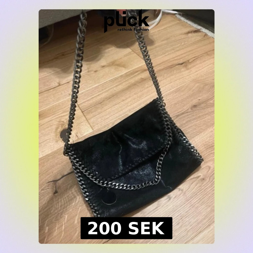 Snygg svart axelväska med glansig finish och silverfärgade kedjor längs kanterna och som axelrem. Väskan har en mjuk, 💕