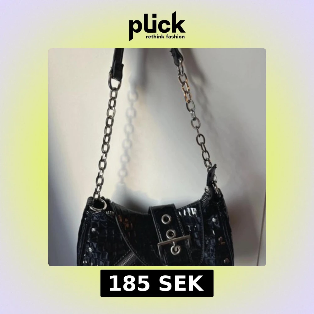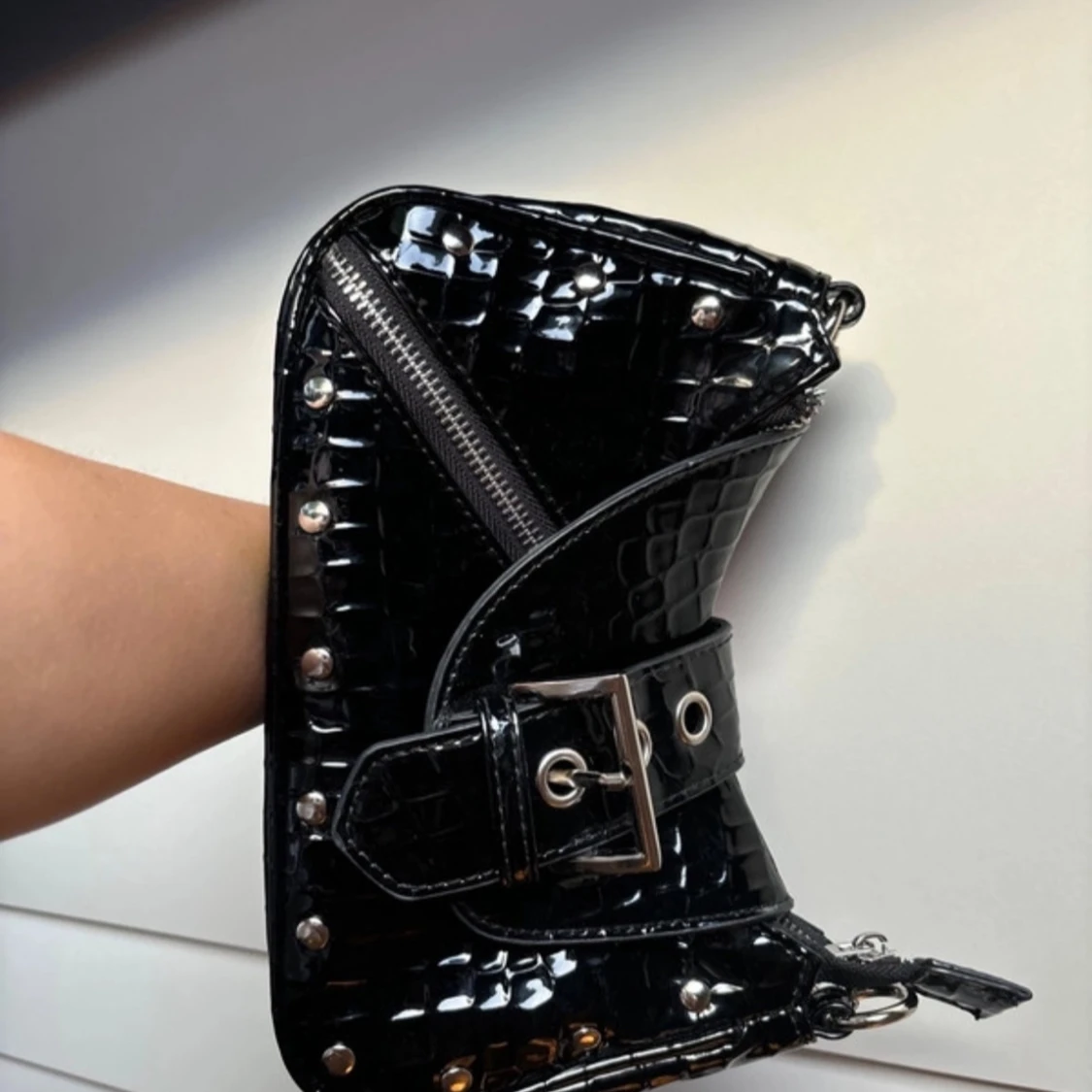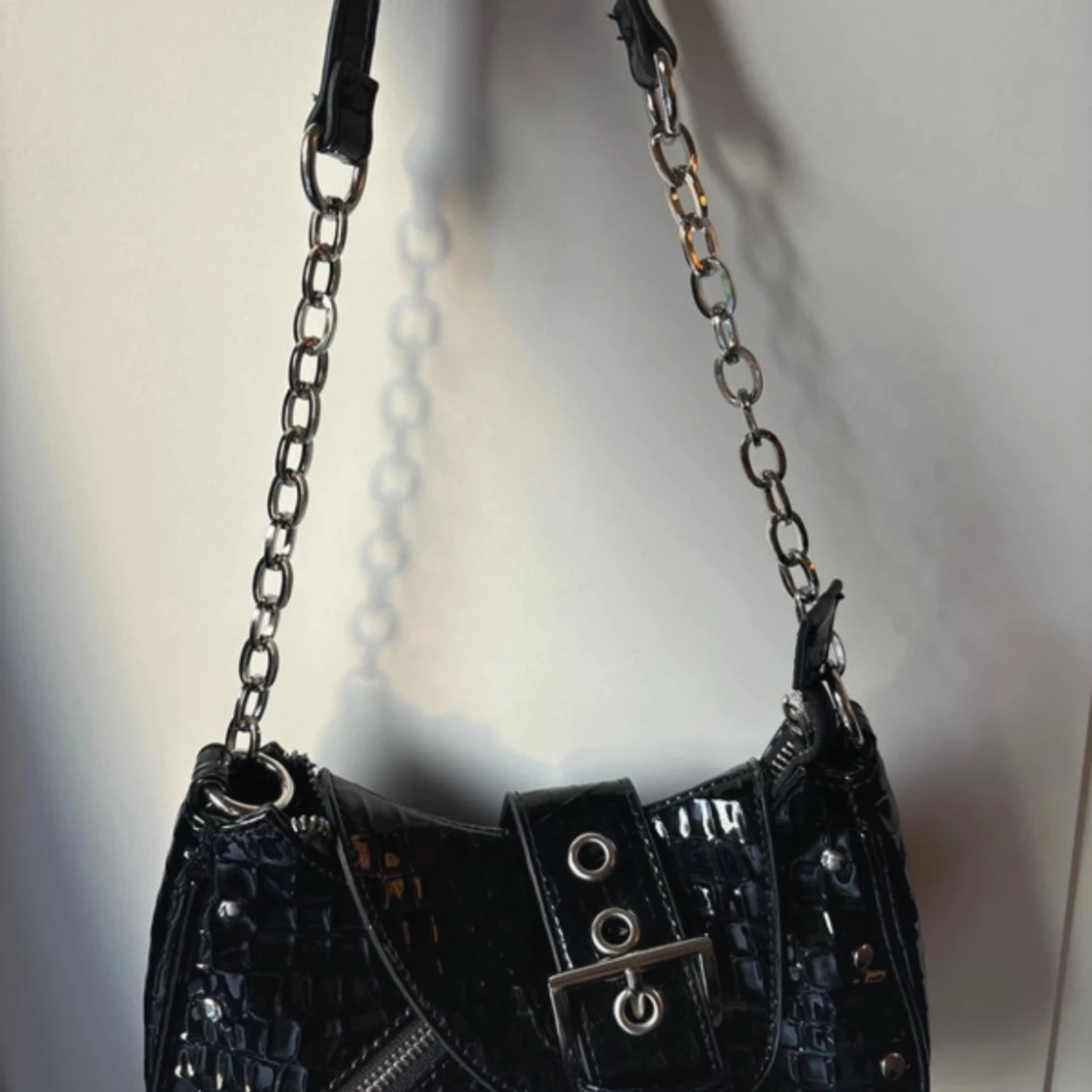 Snygg svart axelväska i syntet med glansig finish och kedjedetaljer. Väskan har en dragkedja och ett bälte med spänne framtill. Perfekt för att ge din outfit en edgy touch.