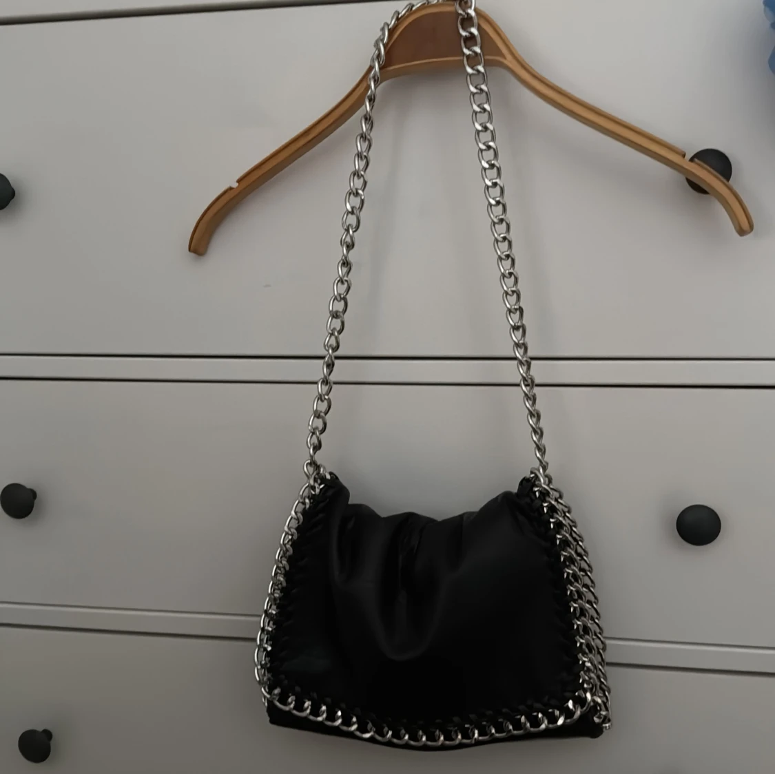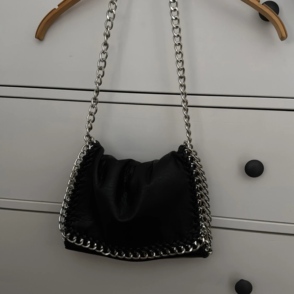 Snygg svart axelväska med coola kedjedetaljer. Perfekt för att ge din outfit en edgy touch. Väskan har en stilren design och är lätt att matcha med olika stilar.