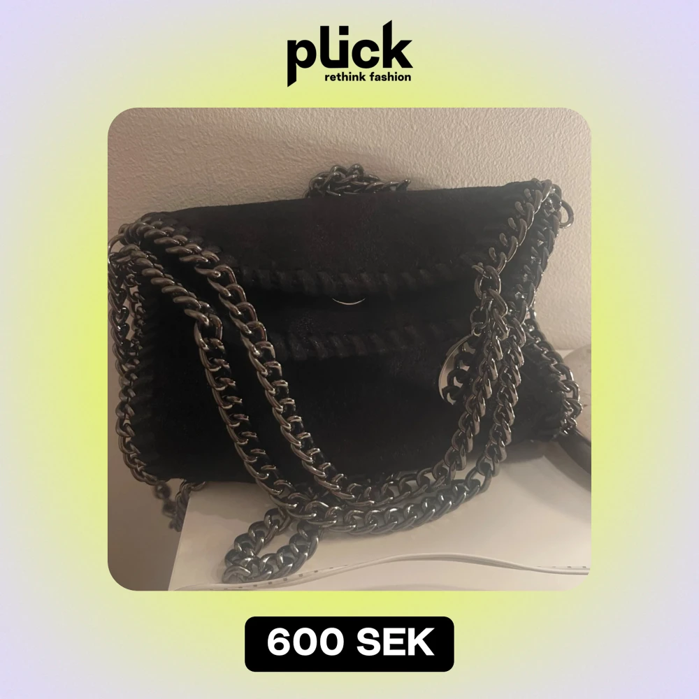 Snygg svart axelväska i mocka med coola kedjedetaljer runt kanterna och som axelrem. Väskan har en praktisk magnetknapp för enkel stängning och en ljusrosa insida. Perfekt för både vardag och fest! Liknade stella väska, känns som en helt ny och är skit fin på, skriv för mer bilder.