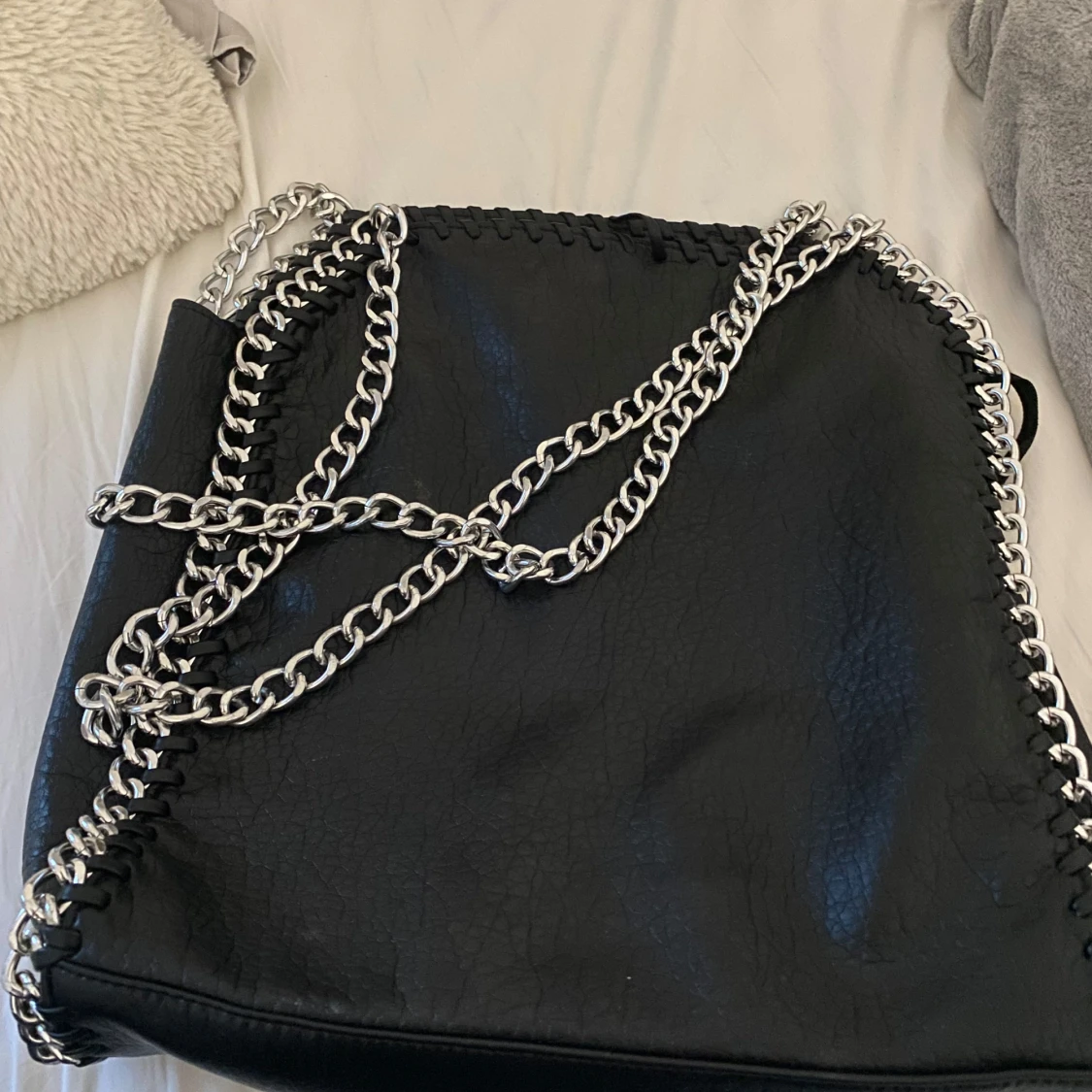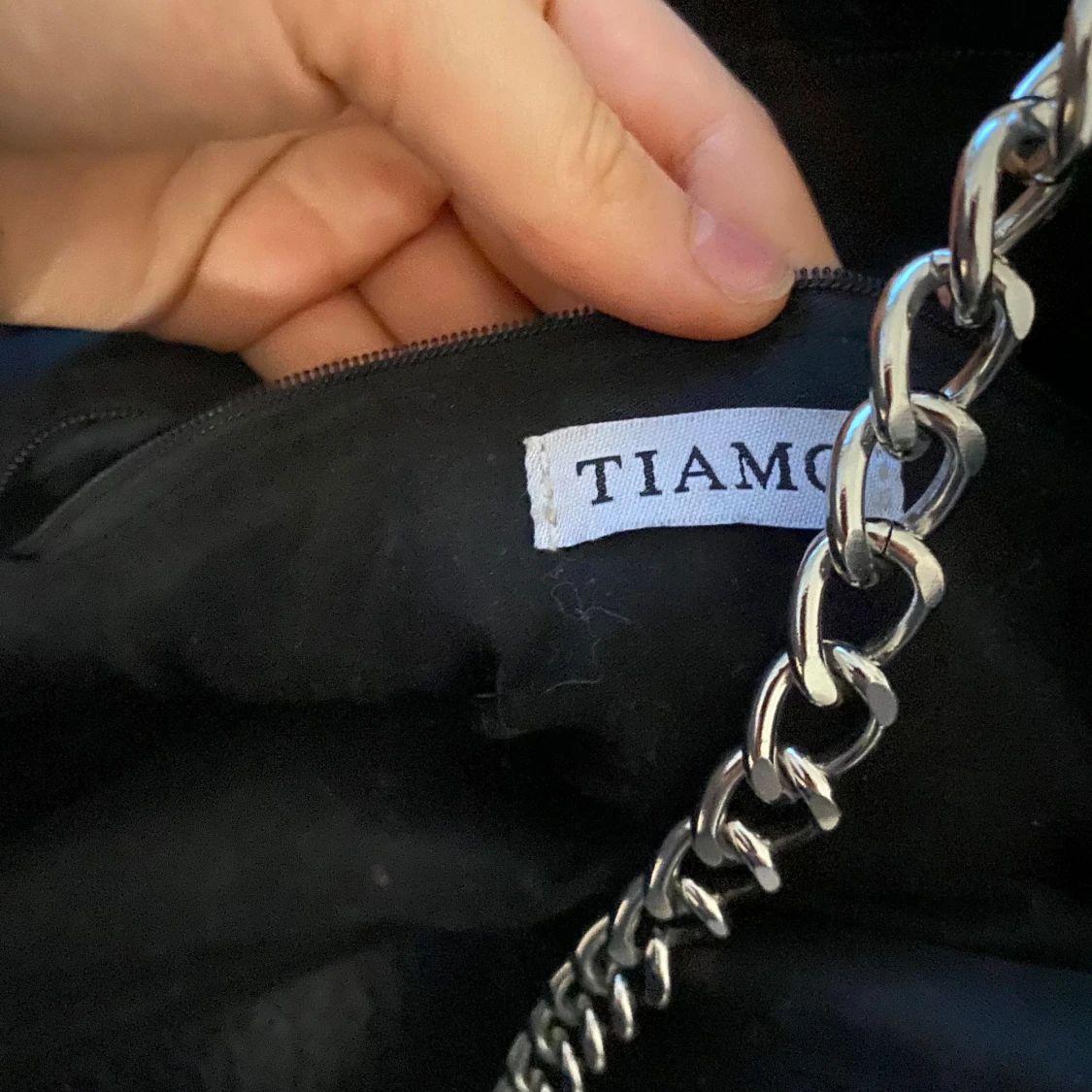 Snygg svart axelväska från Tiamo med coola kedjedetaljer. Väskan har en stilren design med silverfärgade kedjor som ger en edgy look. Perfekt för att lyfta vilken outfit som helst.