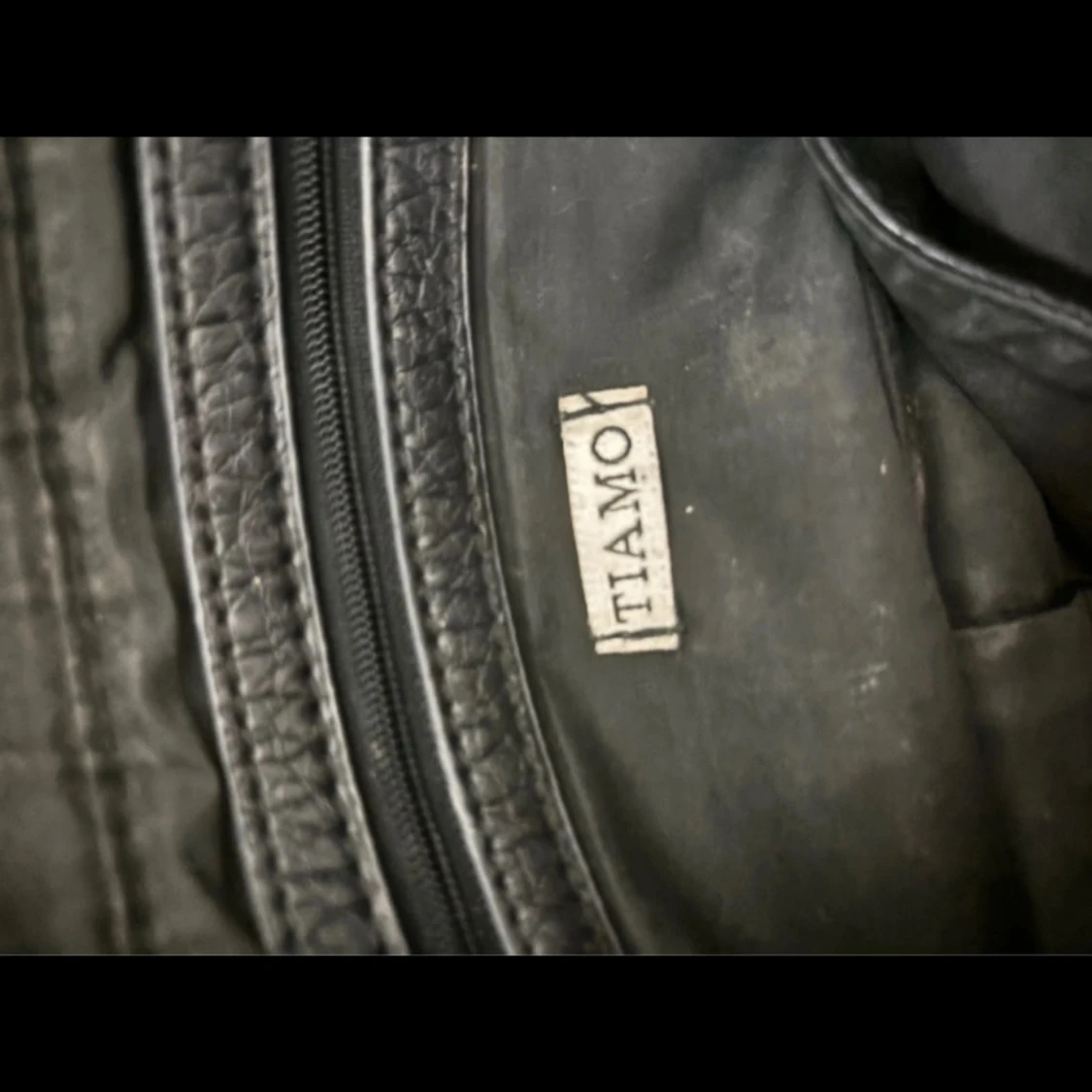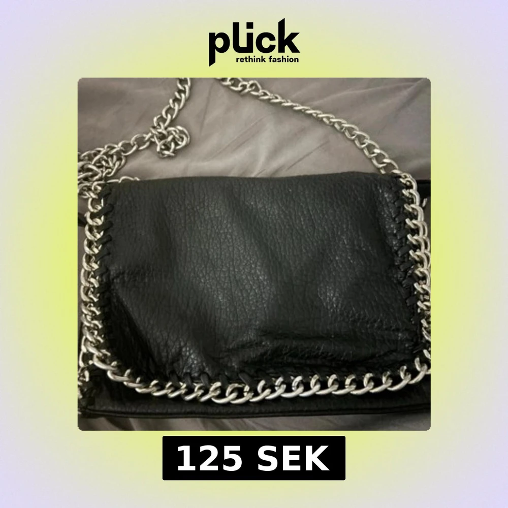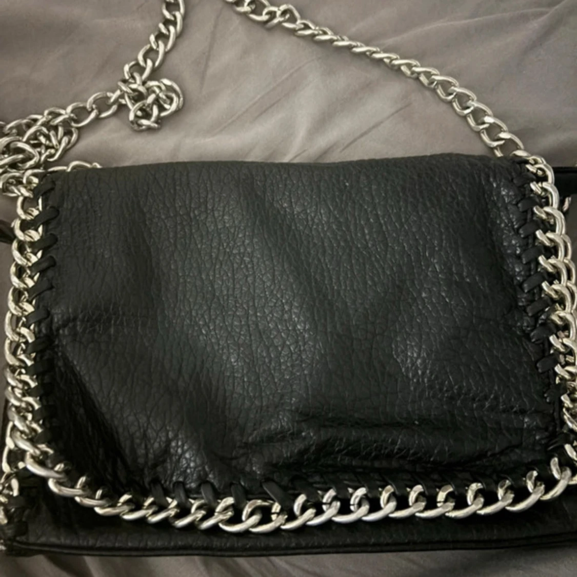 Säljer en svart axelväska från Tiamo i skinnimitation med grova silverfärgade kedjor längs kanterna. Pris kan sänkas vid snabb affär