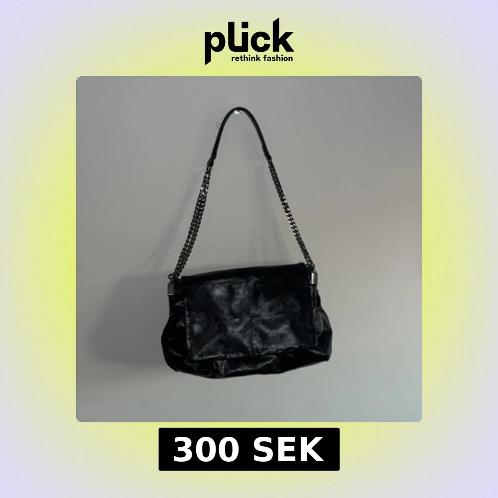 Snygg svart axelväska i skinn med kedjedetaljer på axelremmen. Väskan har flera fack med dragkedja och en praktisk magnetknapp för enkel stängning. Perfekt för att hålla ordning på dina saker med stil.