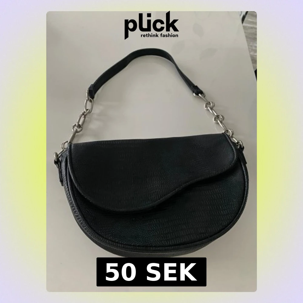Snygg svart axelväska med rundad form och strukturmönster som ger en cool look. Väskan har ett lock med magnetknäppning och en axelrem med silverfärgade kedjor. Materialet är skinnimitation och insidan är enkel och stilren.Magnet började ändra färg.