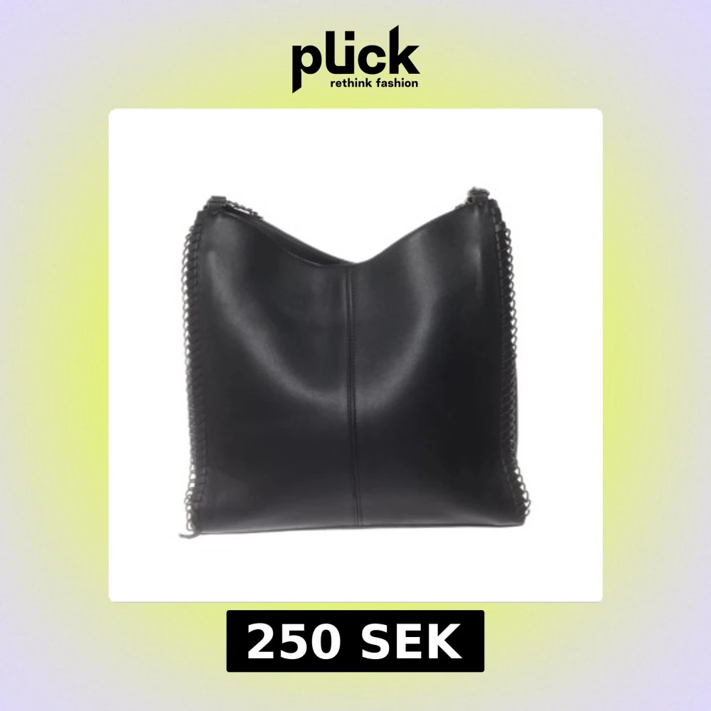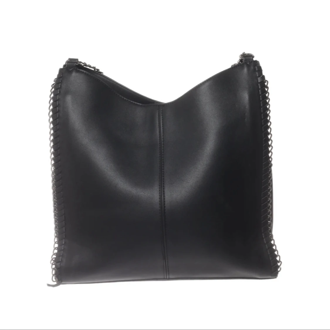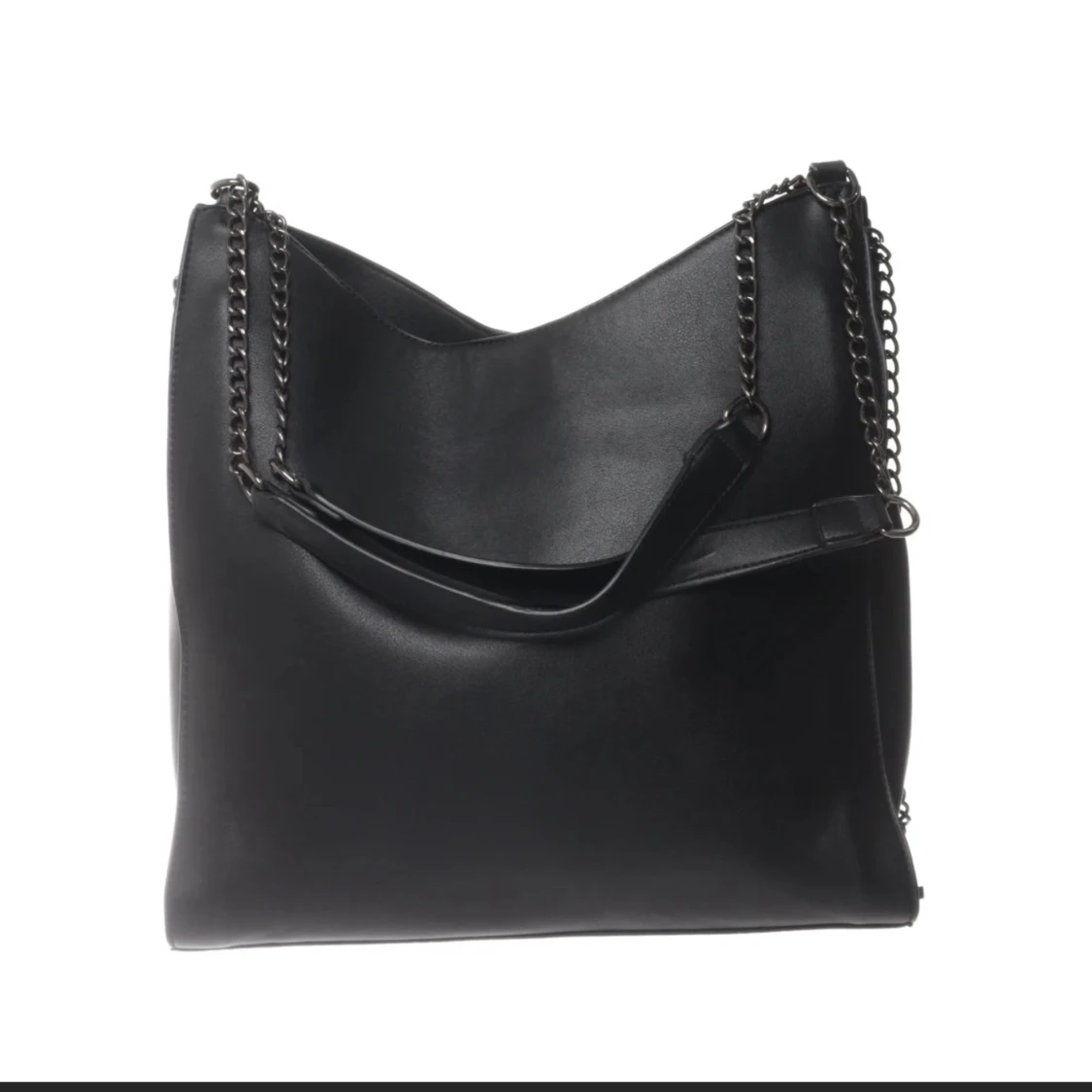 Stilren svart axelväska i skinn med coola kedjedetaljer längs kanterna och som axelrem. Väskan har en mjuk, slät yta och en rymlig form som gör den perfekt för att bära med sig allt man behöver. Kedjorna ger en edgy vibe och gör väskan till ett statement.