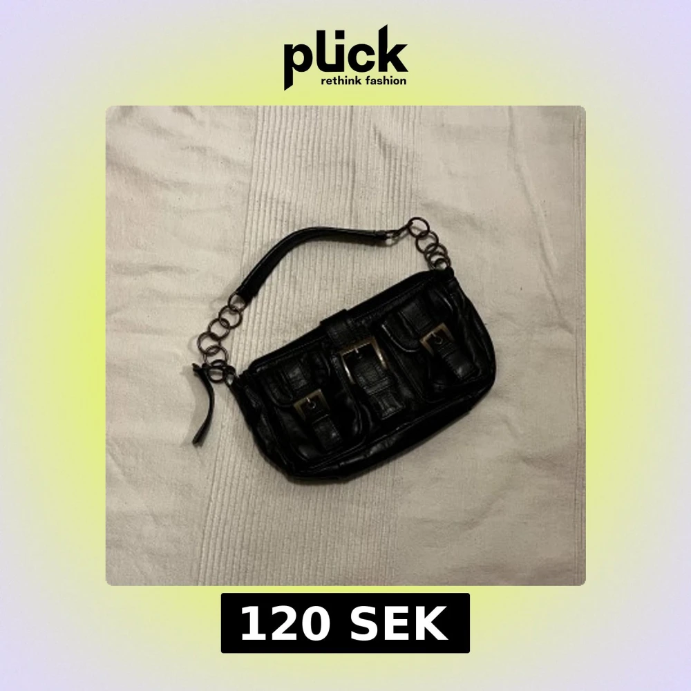 Snygg svart liten axelväska i skinn med coola kedjedetaljer på axelremmen. Väskan har två framfickor med spännen och en dragkedja upptill🥀