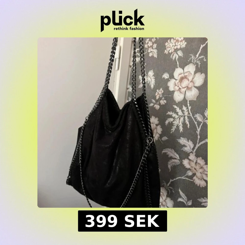 Cool svart axelväska med grova silverfärgade kedjor som axelremmar och längs kanterna. Väskan är mjuk och har en lätt glansig yta, troligen i syntet eller mockaimitation. Rymlig insida med dragkedjefack. Perfekt för dig som gillar edgy och trendig stil.