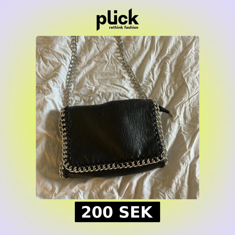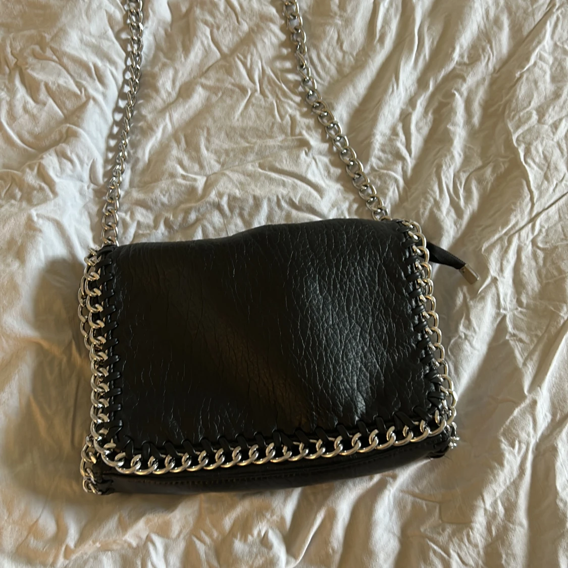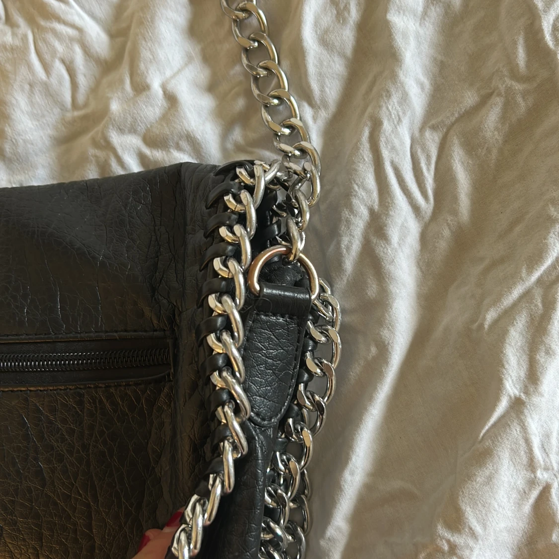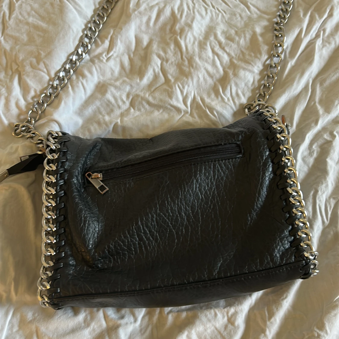 Cool svart axelväska i skinnimitation med grov silverkedja runt kanterna och som axelrem. Väskan har en dragkedja på baksidan och ett snyggt, lite rynkat material. Perfekt för dig som gillar edgy detaljer och vill sticka ut.