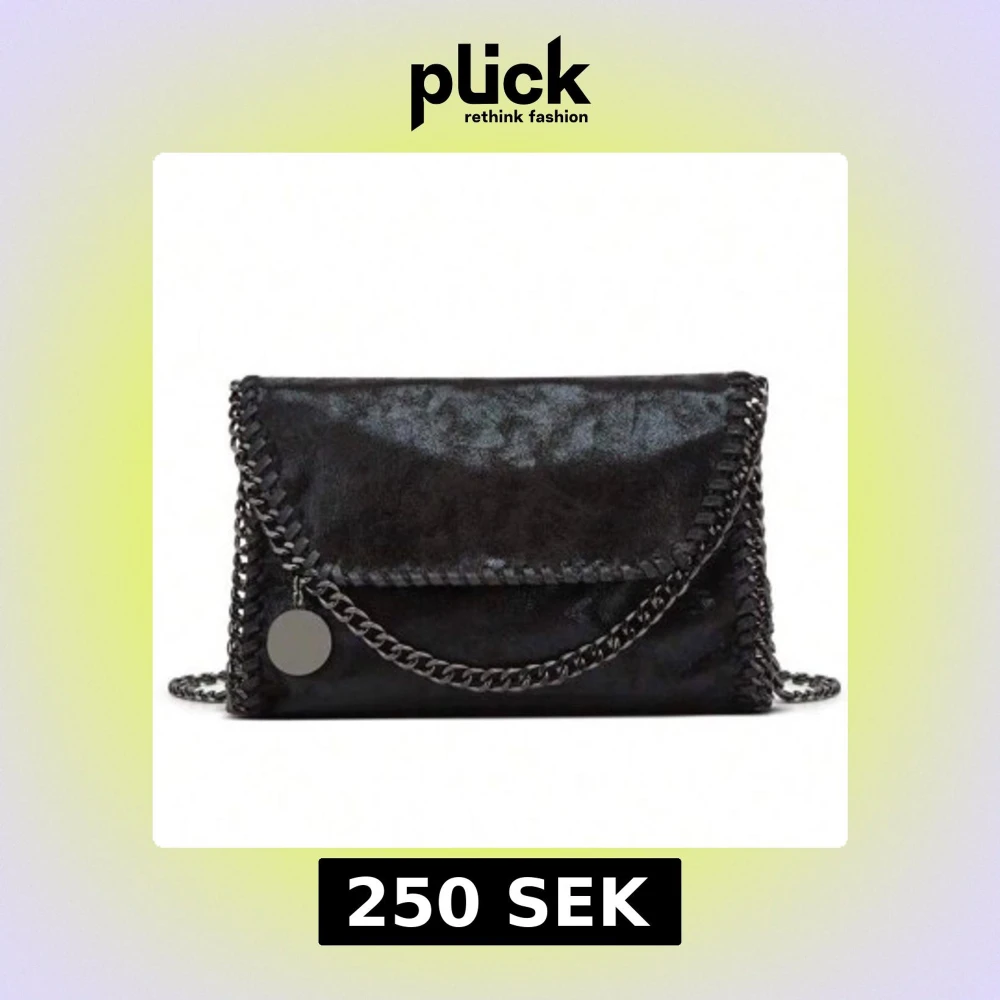 Snygg svart axelväska i syntetmaterial med coola kedjedetaljer runt kanterna och som axelrem. Väskan har ett kuvertformat lock och en rund metallbricka som dekoration. Perfekt för dig som gillar en edgy och trendig stil. Liknar Stella mccartney