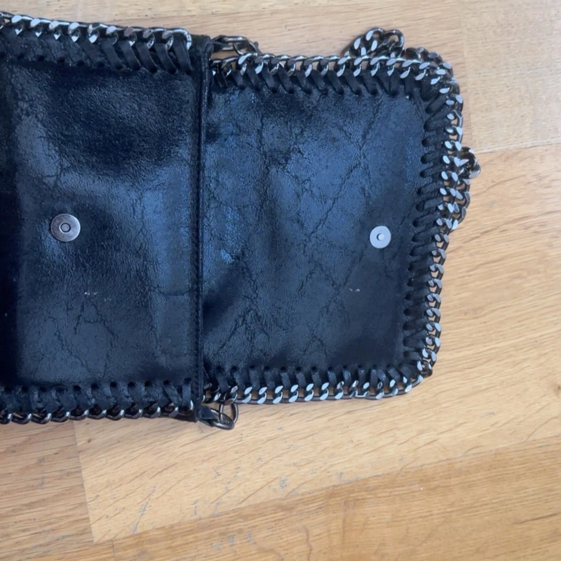 Säljer en svart axelväska i skinn med grov kedjerem och dekorativa kedjedetaljer runt kanterna. Väskan har magnetlås och en stilren, lite edgy look. Perfekt för dig som gillar att gömma trender. Den har en liten vit fläck på insidan av skinnet som man ser på bilden men inget som synd alls när väskan är stängd❤️köpt i en butik i Italien och väskan är i äkta skinn❤️