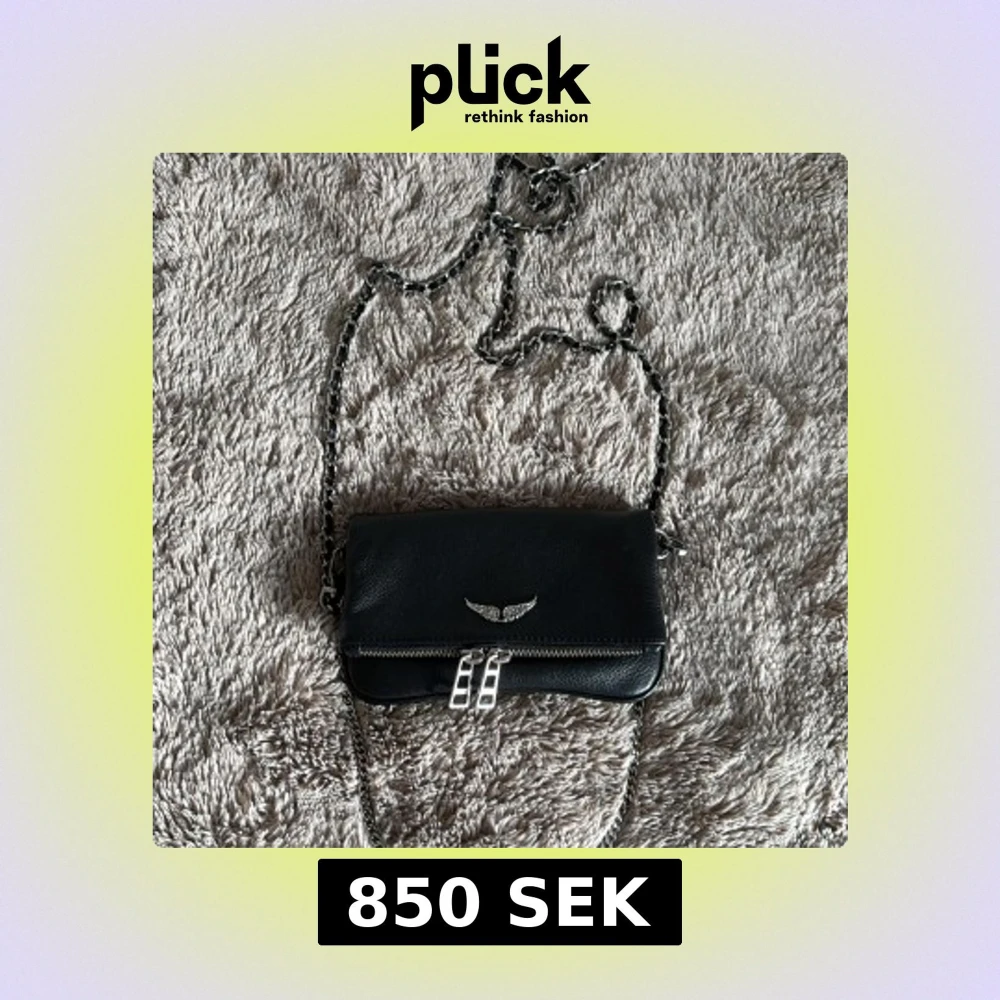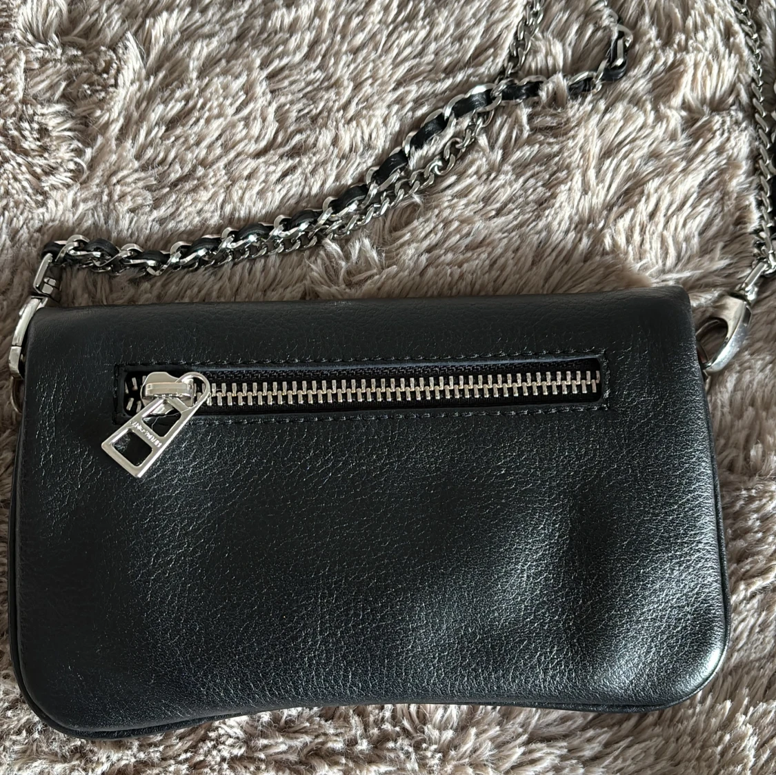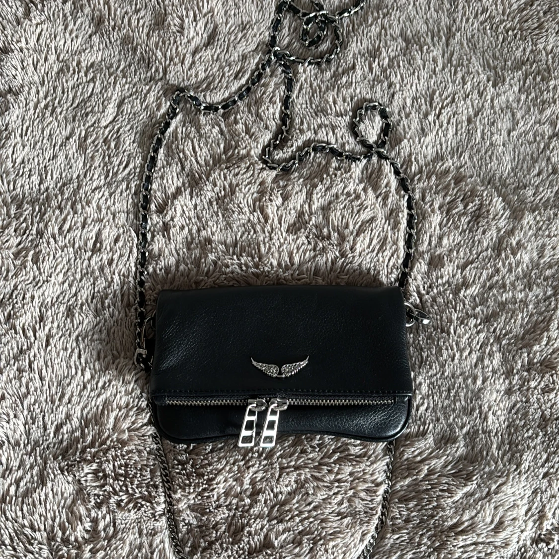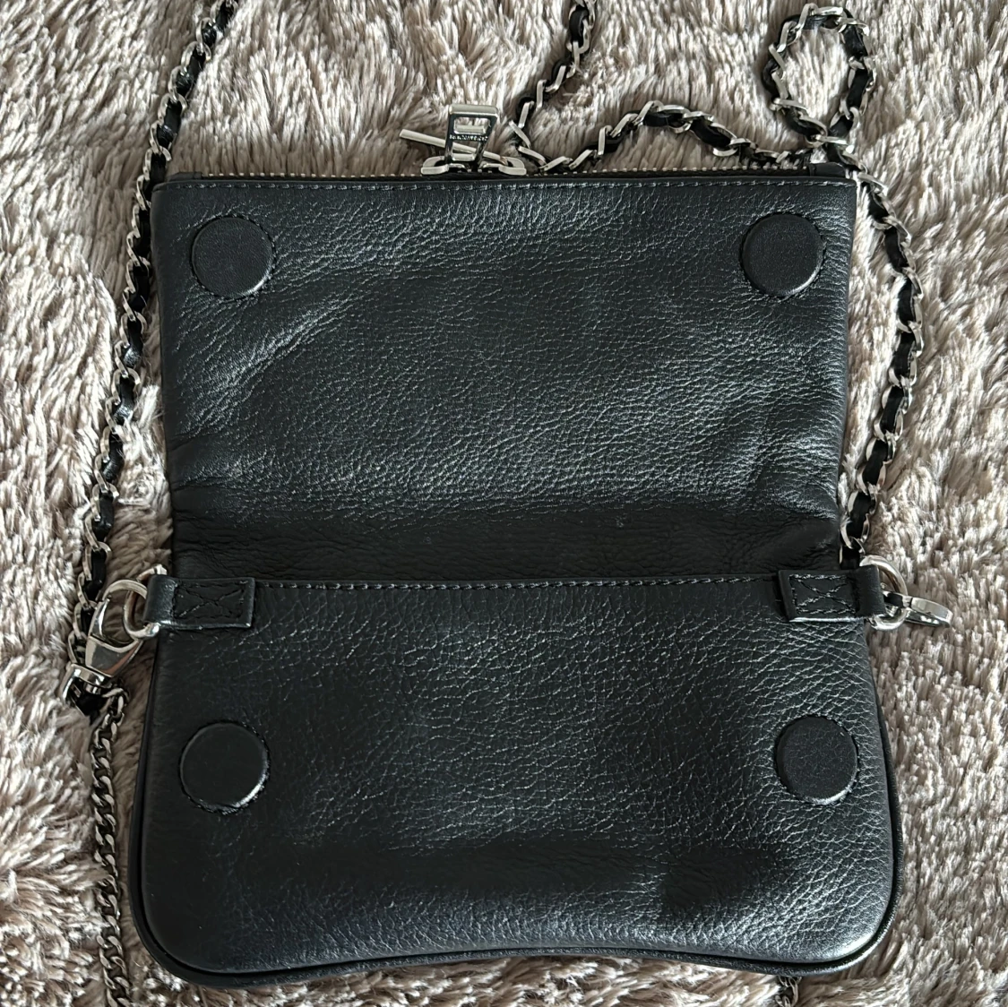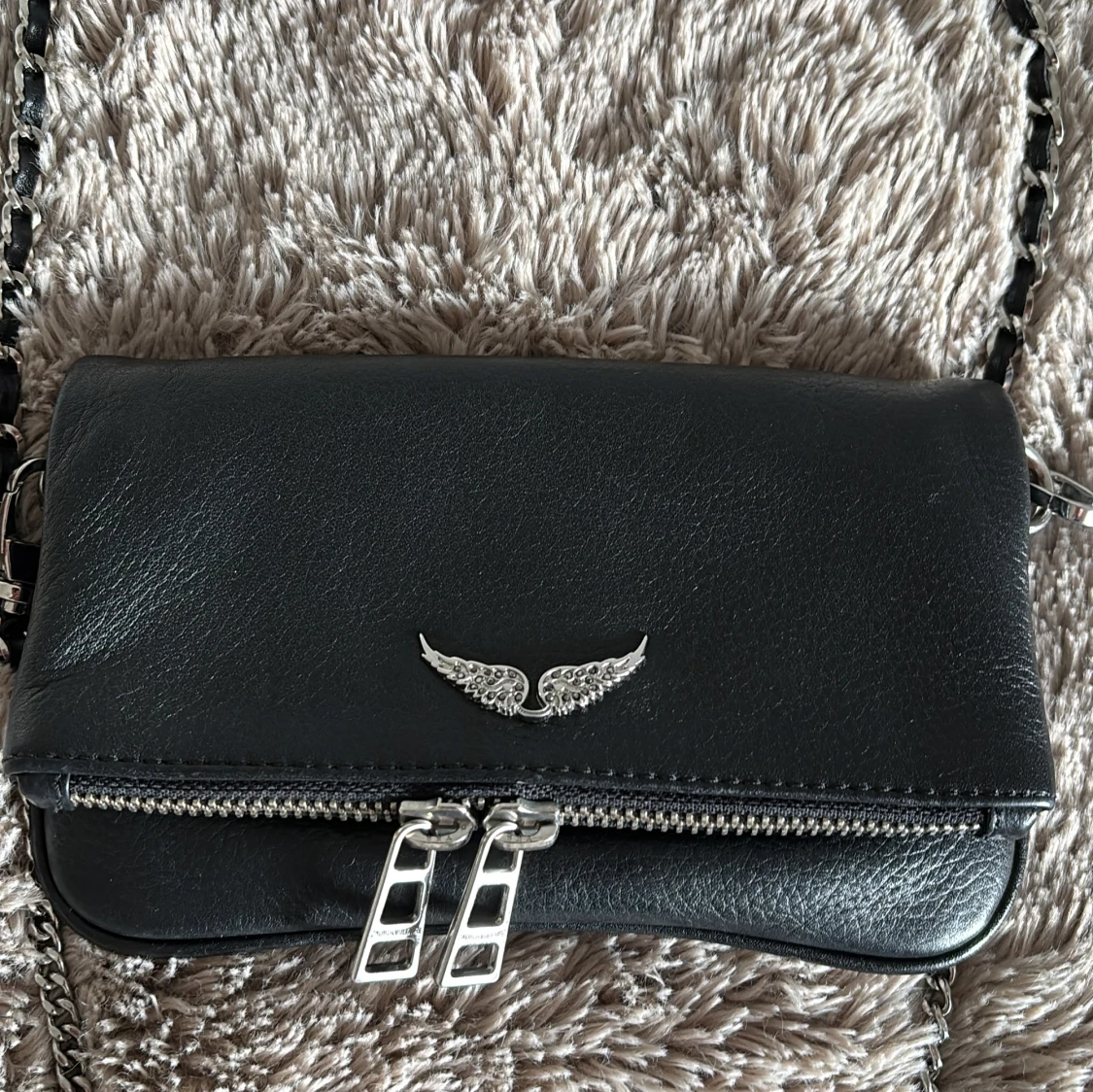 Snygg svart axelväska i skinn med silverfärgade detaljer och kedjerem. Väskan har dubbla dragkedjor framtill, ett coolt vingemblem i metall och extra fack på baksidan. Perfekt storlek för mobilen och det viktigaste. Stilren och edgy vibe.