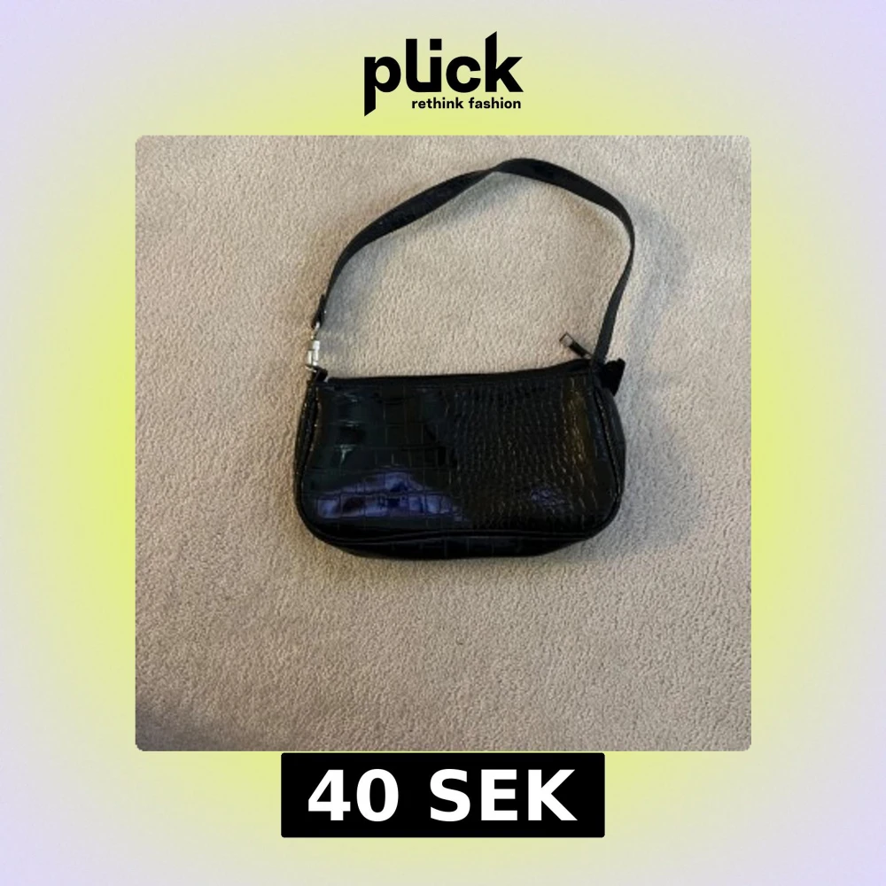 Säljers en svart axelväska med glansig krokodilpräglad yta. Väskan har ett kort axelband och stängs med dragkedja upptill. Perfekt för att bära det viktigaste och ger en trendig touch till din outfit.
