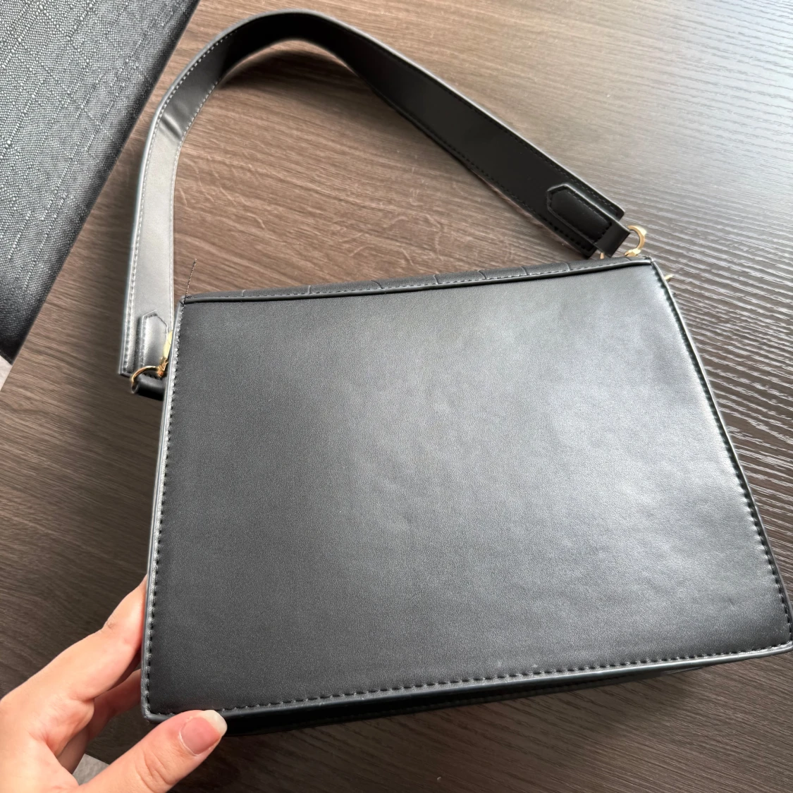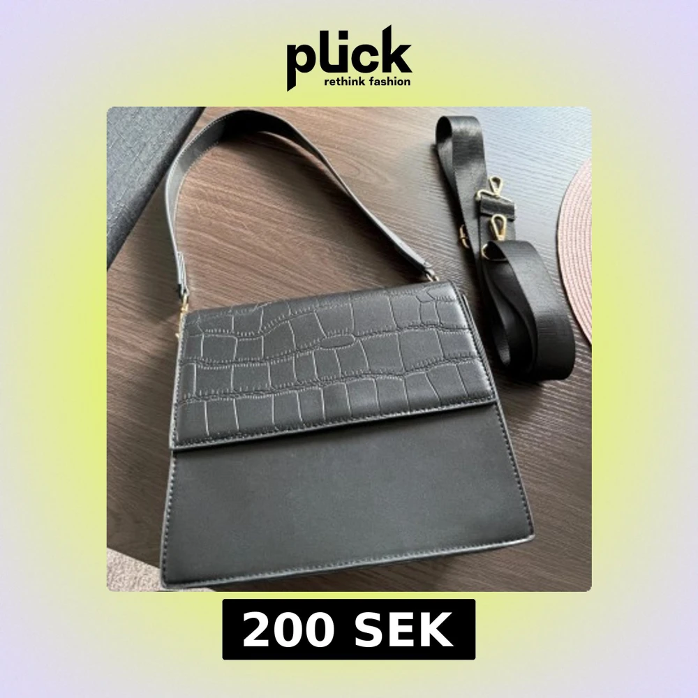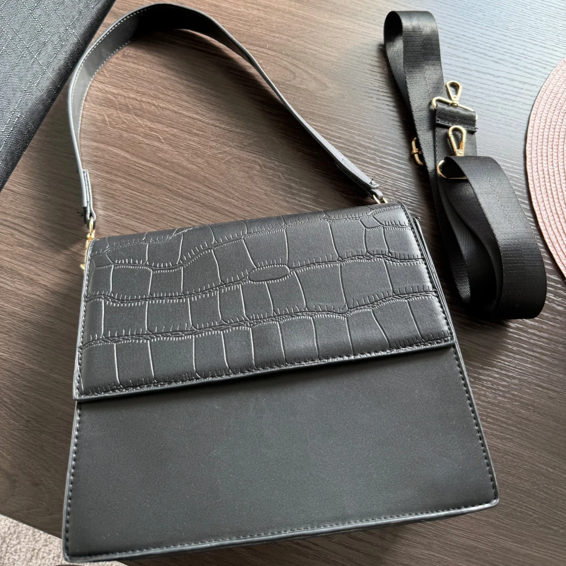 Stilren svart axelväska med fyrkantig form och lock i krokopräglat skinnimitation. Väskan har bred axelrem och extra avtagbar rem i textil med guldfärgade detaljer. Perfekt för dig som gillar minimalistisk och trendig design.