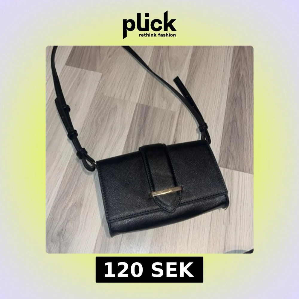 Säljer en stilren svart axelväska i syntetmaterial med justerbart axelband och guldfärgad detalj på locket. Insidan har ett coolt leopardmönstrat foder och en innerficka med dragkedja. Perfekt storlek för det viktigaste!