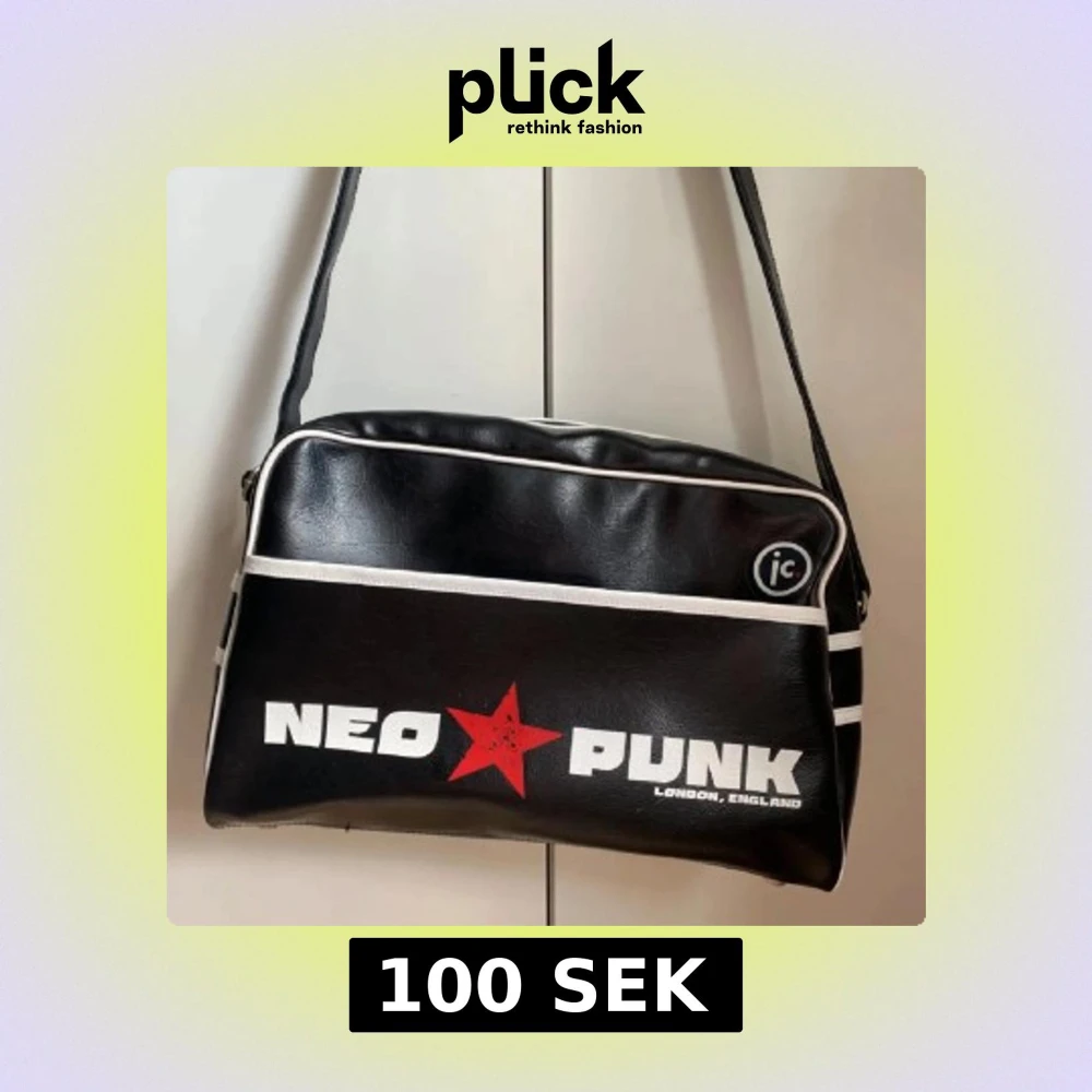 Cool svart axelväska med Neo Punk-tryck i vitt och en röd stjärna. Väskan har vita detaljer och en justerbar axelrem. I fint skick! Rymlig då den får plats med dator och mera🌟