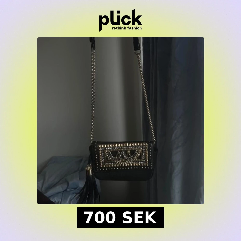 Snygg svart axelväska med kedjeaxelrem och coola nitar på framsidan. Väskan har en dekorativ fransdetalj på sidan som ger den extra edge. Perfekt för att ge din outfit en rockig touch.