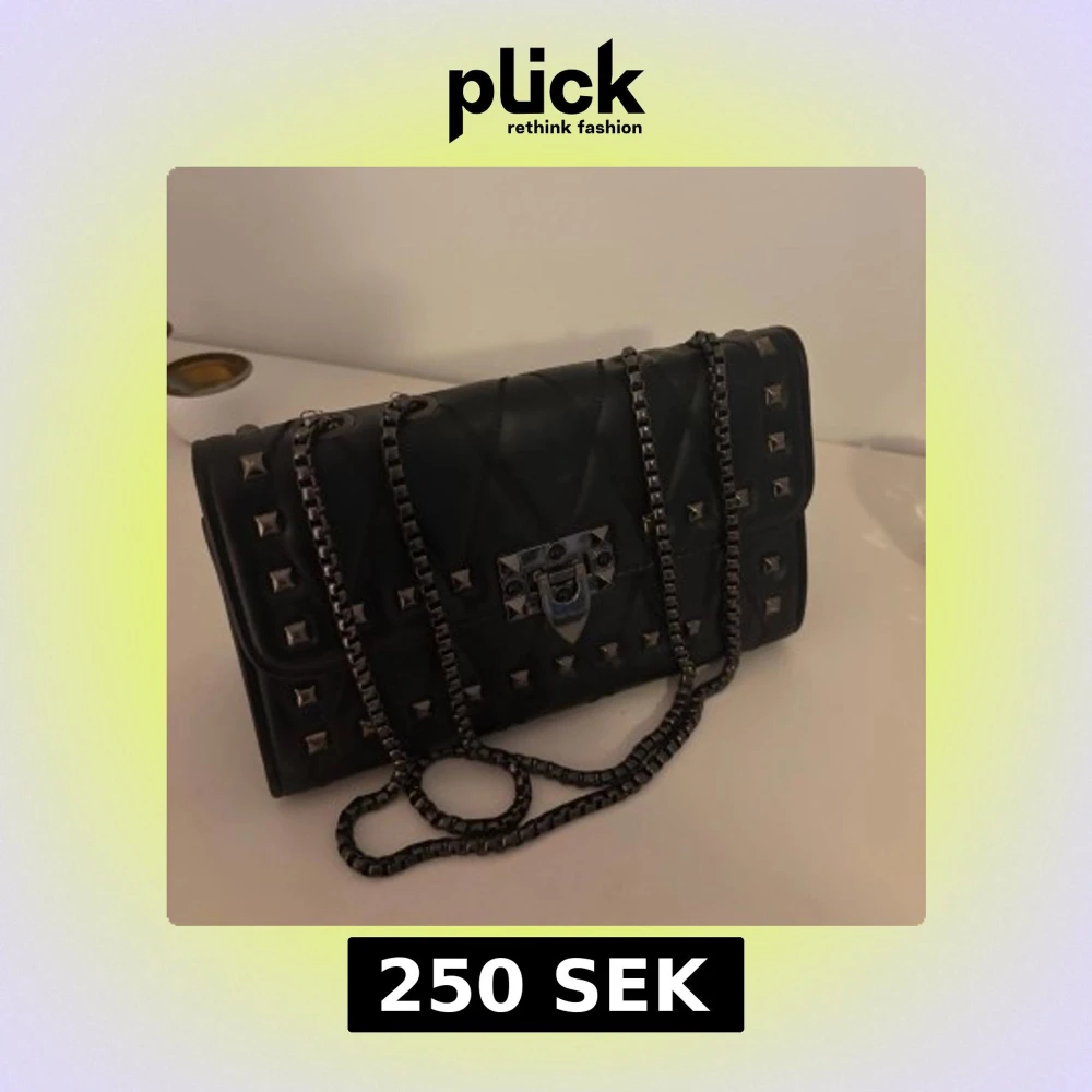 Snygg svart axelväska med quiltad design och coola nitar. Väskan har en kedjerem och ett metallspänne framtill. Perfekt för att ge din outfit en edgy touch.