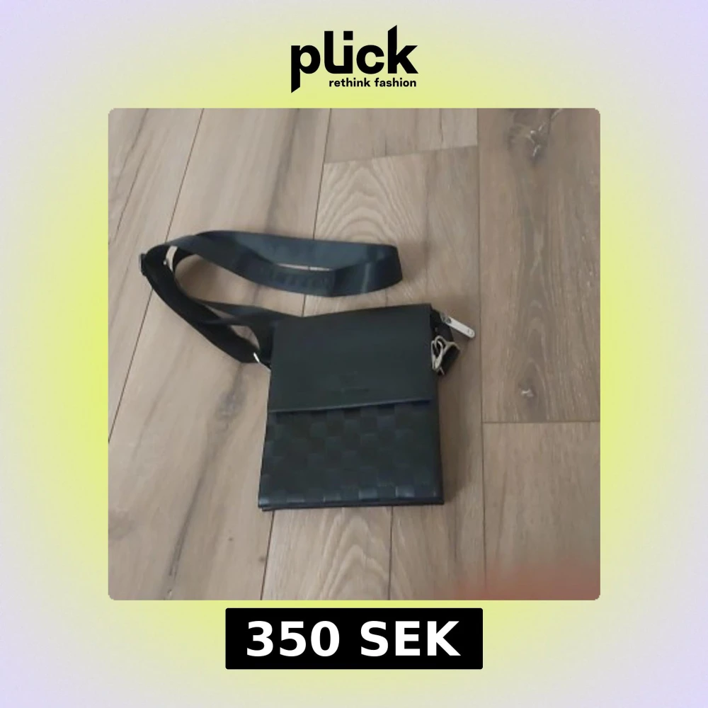 Snygg svart axelväska med rutigt mönster på framsidan och bred axelrem. Väskan har ett stilrent och modernt utseende, perfekt för att bära det viktigaste. Materialet ser ut att vara skinn eller syntet och väskan stängs med lock och dragkedja.