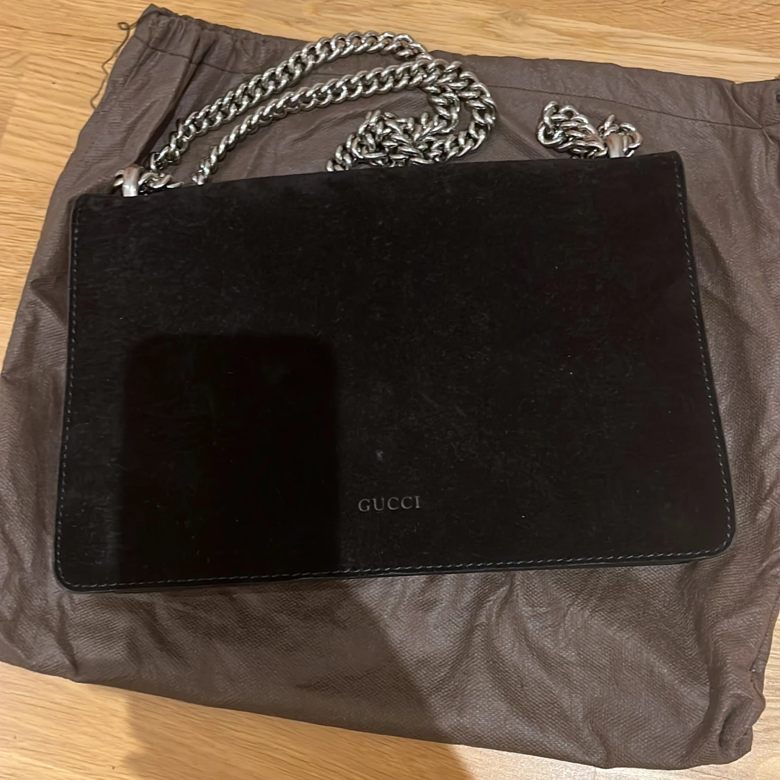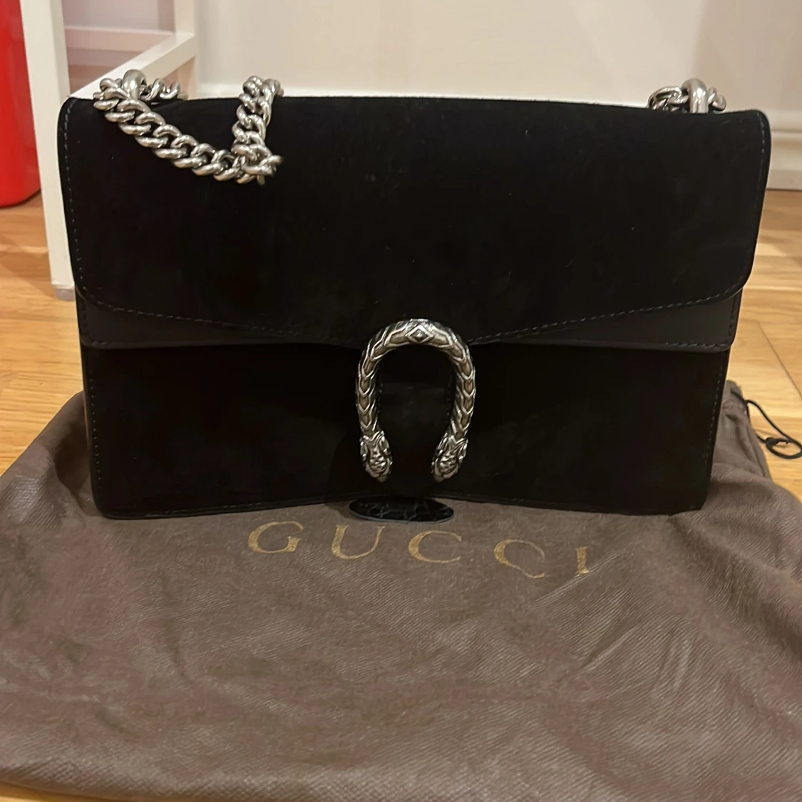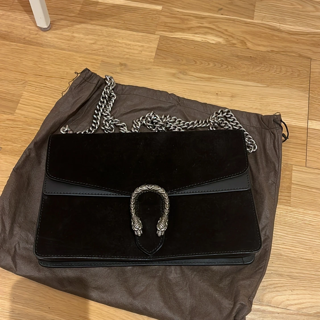 Säljer en svart axelväska med snygg silverkedja och dekorativt spänne framtill. Väskan har en stilren design och är tillverkad i skinn med mockadetaljer. Perfekt för dig som vill ha en lyxig accessoar. Inga tecken på användning 🖤