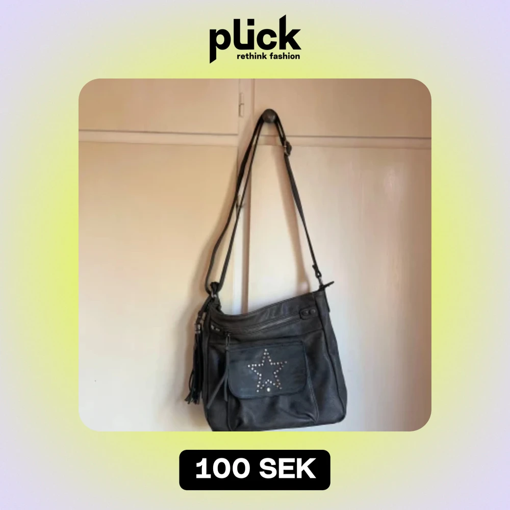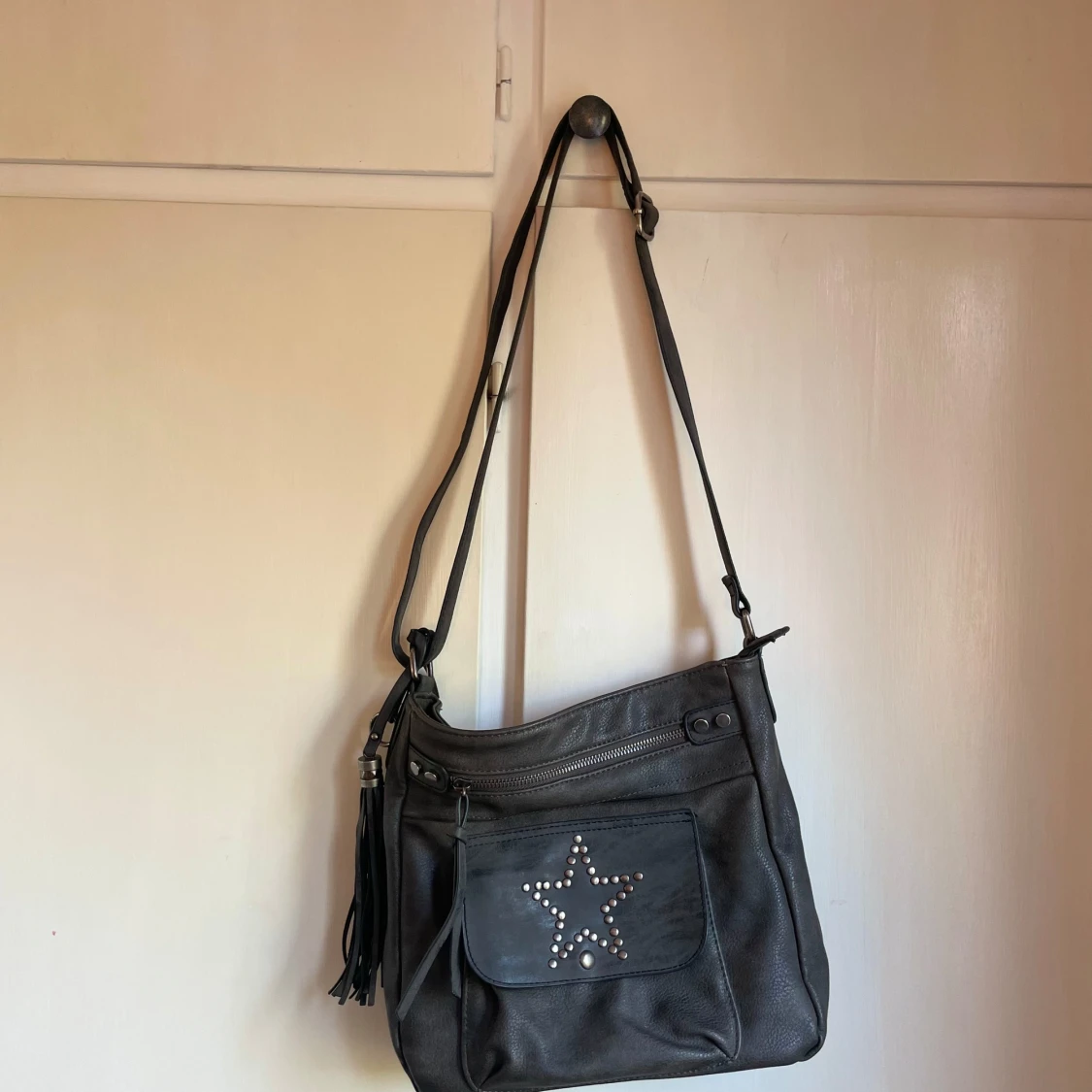Säljer en snygg ”smuts” grå axelväska i skinn med en cool stjärndetalj på framsidan. Väskan har en dragkedja upptill och en justerbar axelrem. Perfekt för både vardag och fest!