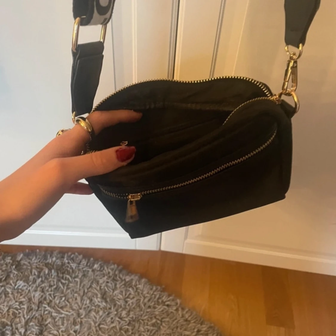Snygg svart axelväska med justerbar axelrem som har texten 'SEE YOU LOVE'. Väskan har en dragkedja och är perfekt för att bära med sig det nödvändigaste. Enkel och stilren design som passar till många tillfällen.