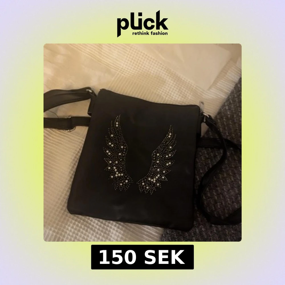 Snygg svart axelväska med coola vingdetaljer i form av små pärlor. Väskan har en justerbar axelrem och en praktisk dragkedja upptill. Perfekt för att ge din outfit en unik touch.