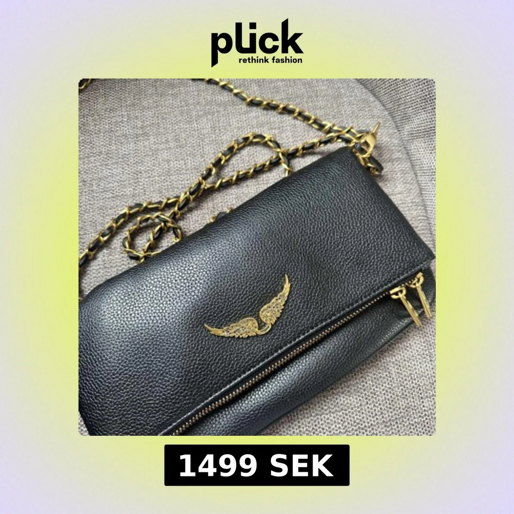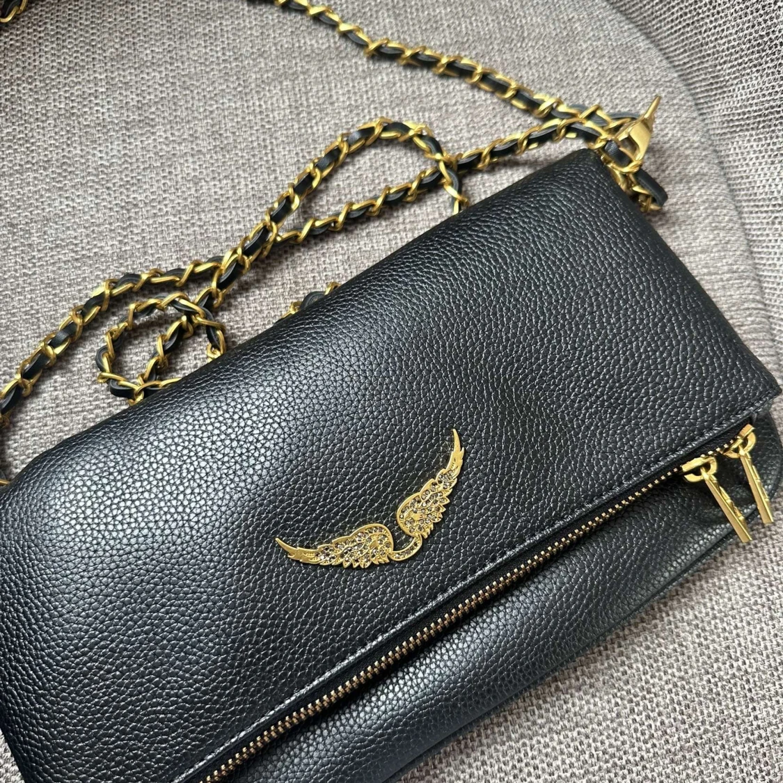 Snygg svart axelväska från Zadig & Voltaire i äkta skinn med guldfärgade detaljer och kedja. Väskan har ett coolt guldfärgat vingemblem på framsidan och dubbla dragkedjor. Perfekt storlek för mobilen och det viktigaste.