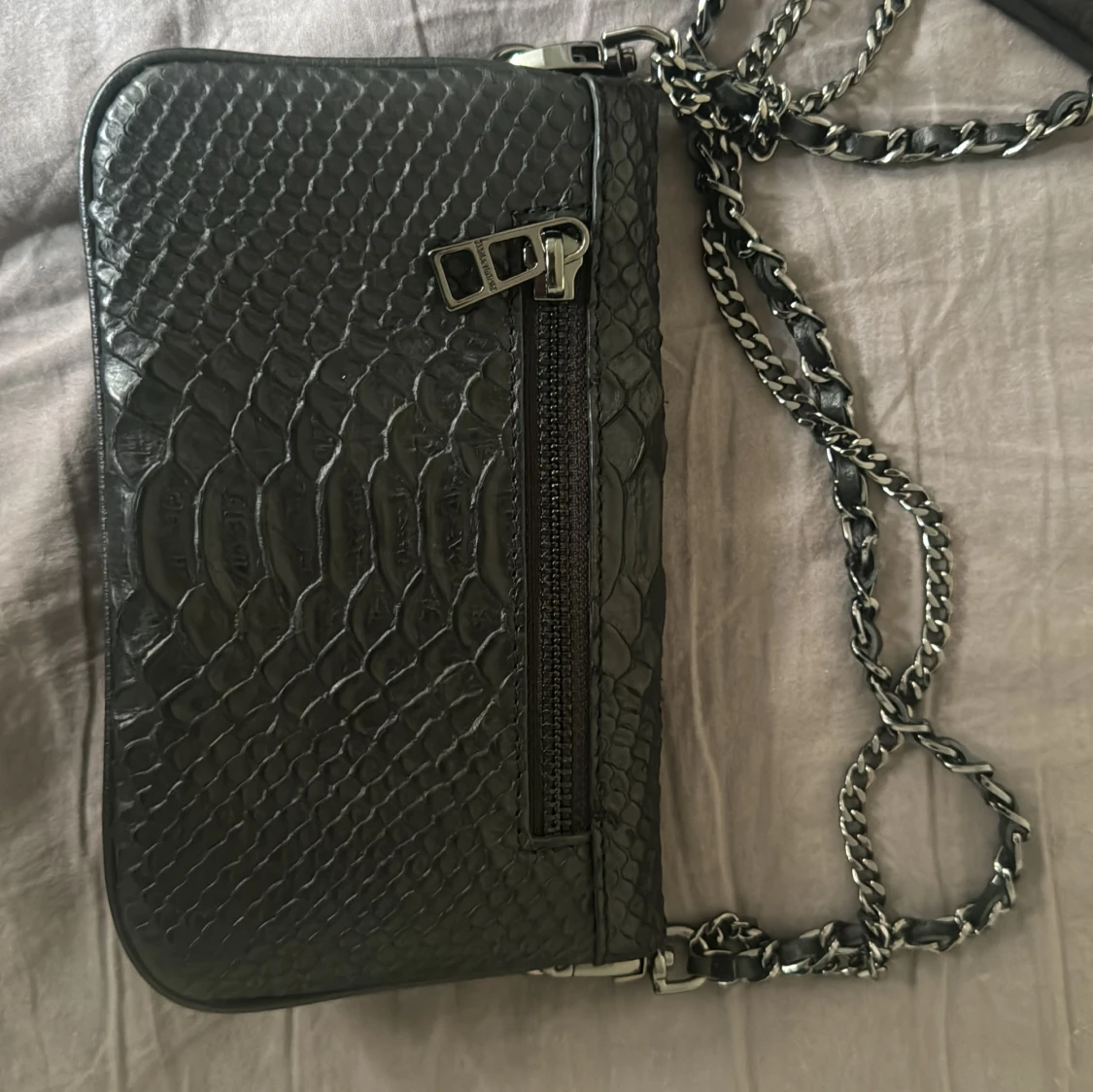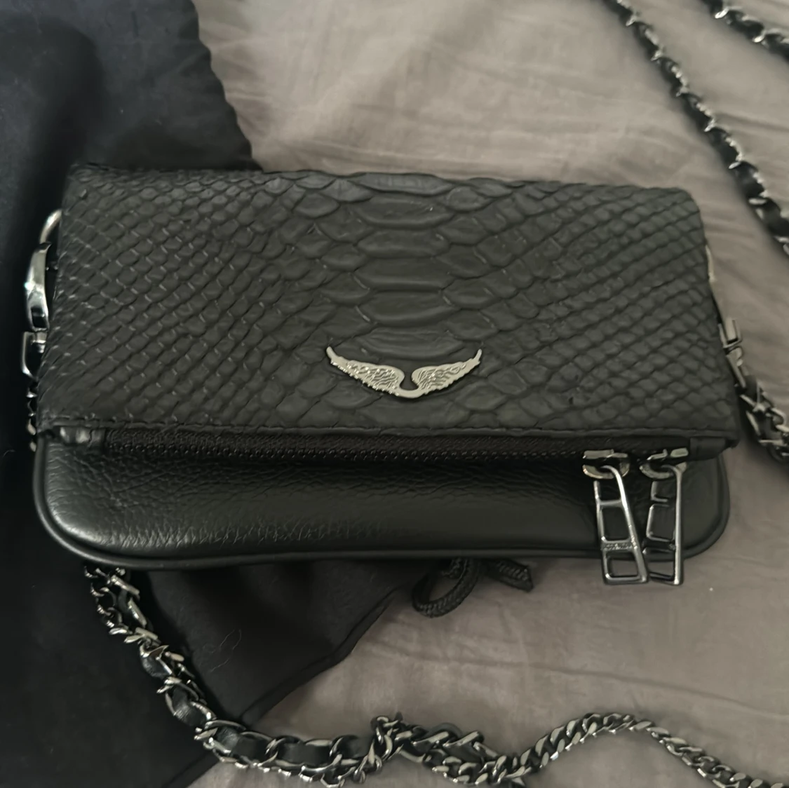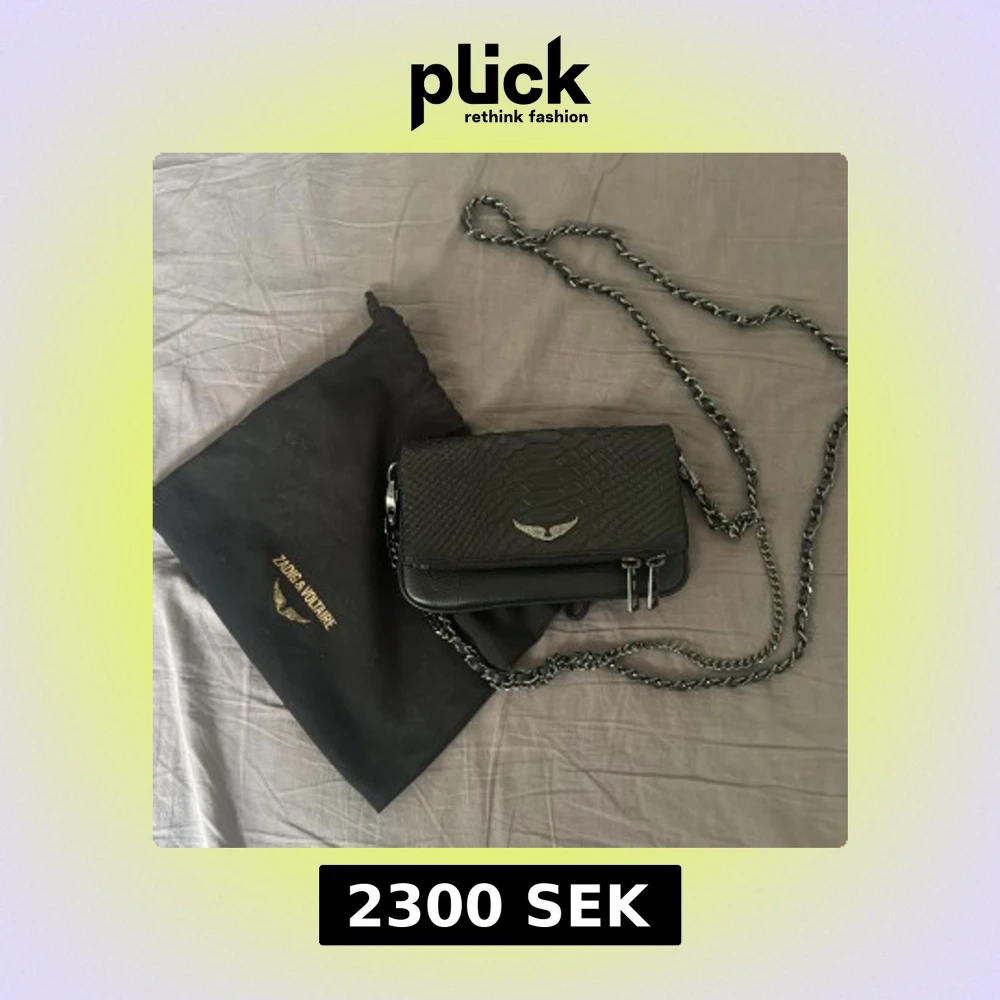 Dustbag ingår 🥰🥰(pris hår att diskutera vid snabbköp) Snygg svart axelväska från Zadig & Voltaire i präglat skinn med ormmönster. Väskan har silverfärgade detaljer, kedjerem och dragkedjor samt ikonisk vinglogga framtill. Perfekt att med med, köpt för 3000kr och är nästan i nyskick.