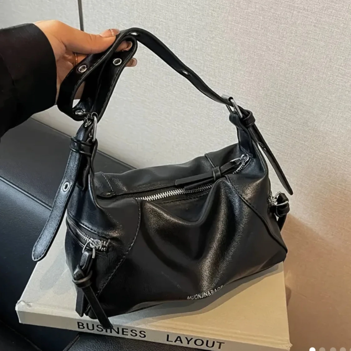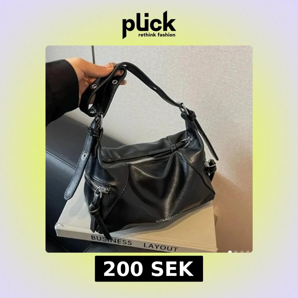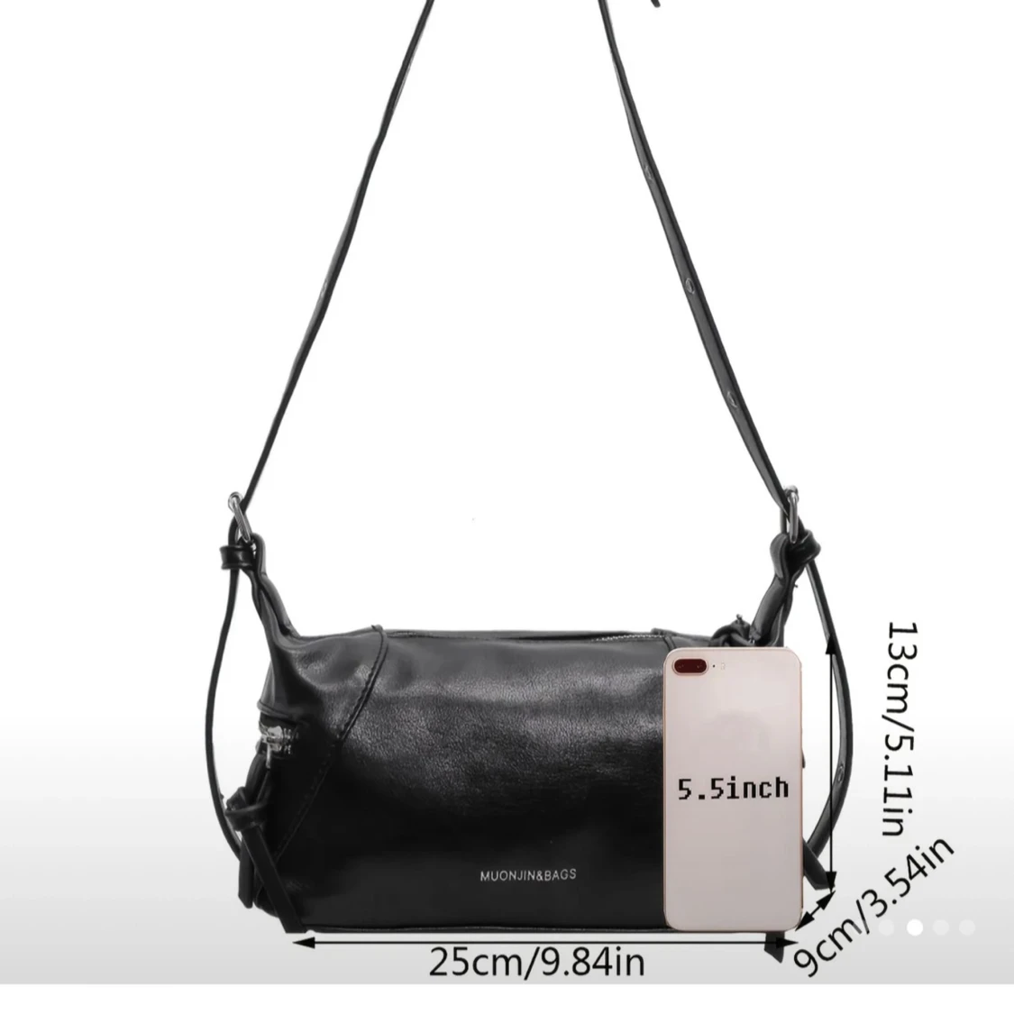 Snygg svart axelväska i skinnimitation med justerbart axelband och dragkedja upptill. Väskan har en stilren design, silverfärgade detaljer och extra fack med dragkedja på sidan. Perfekt storlek för mobil, plånbok och andra essentials.