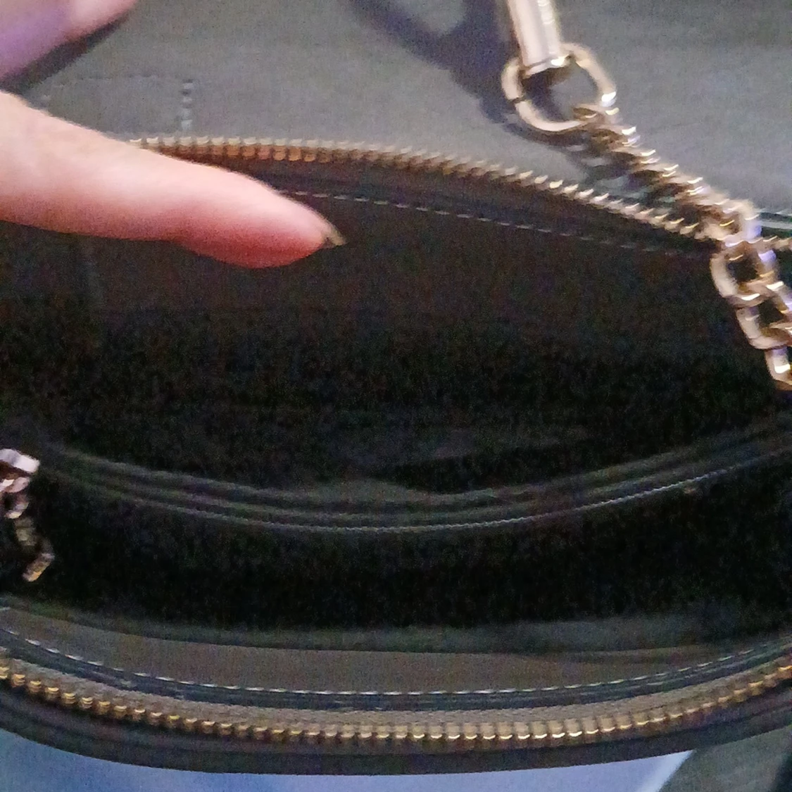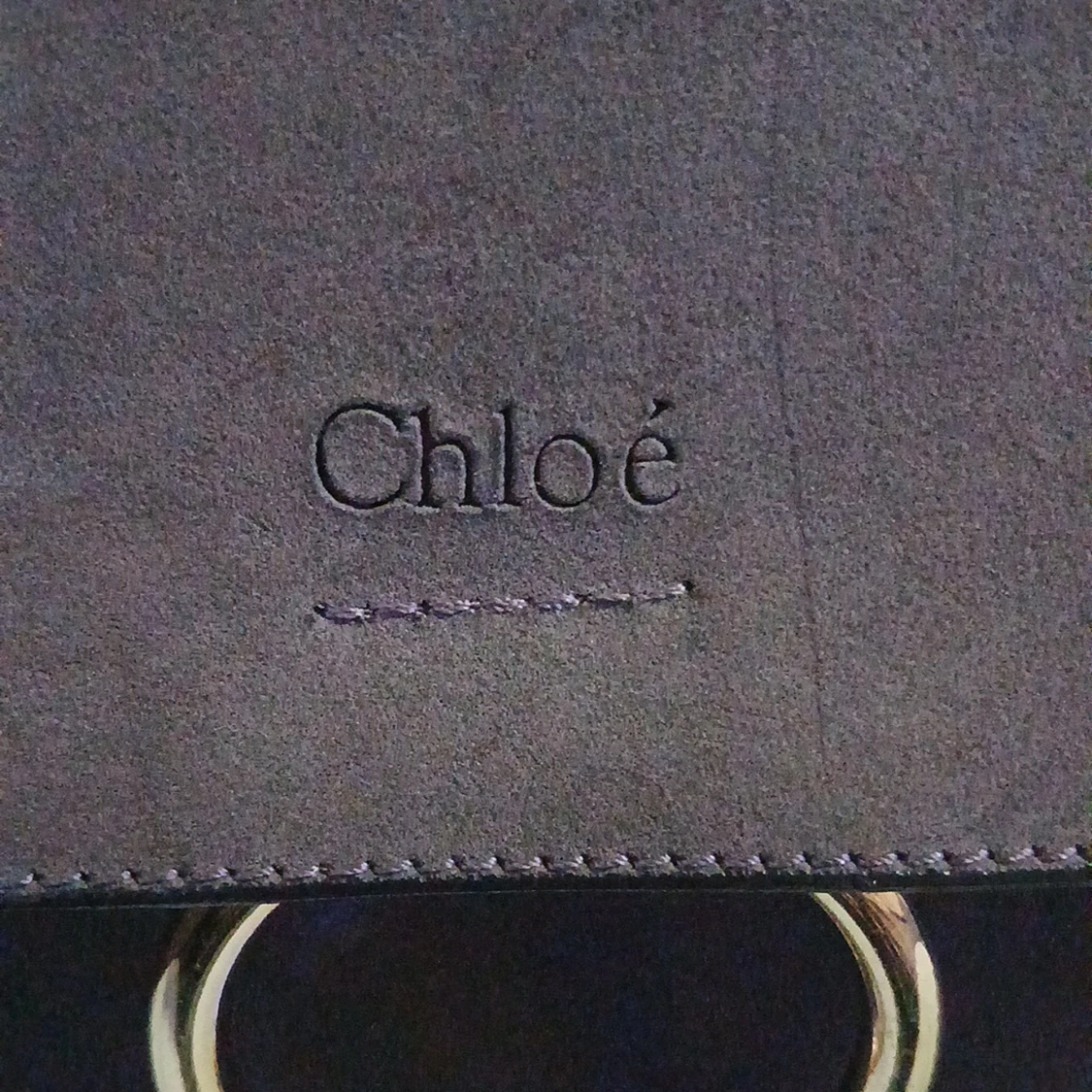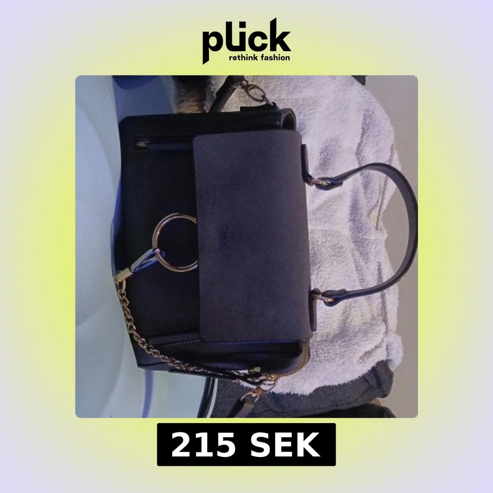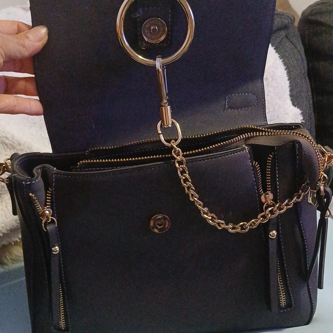 Snygg svart handväska från Chloé i skinn med guldfärgade detaljer och kedja. Väskan har både handtag och axelrem, samt dragkedjor och magnetlås. Stilren design med rund guldring framtill och flera fack för smart förvaring.