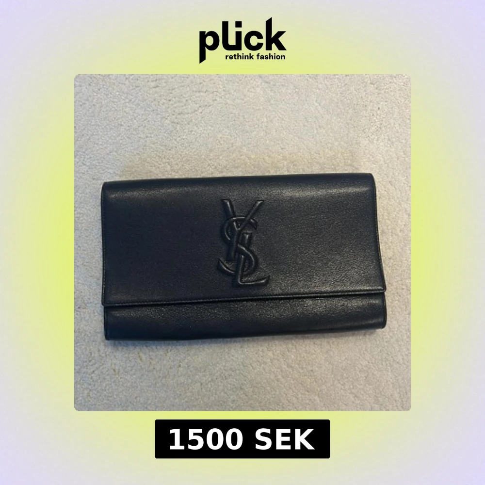 Elegant svart clutch från YSL i skinn med det ikoniska YSL-logotypen på framsidan.