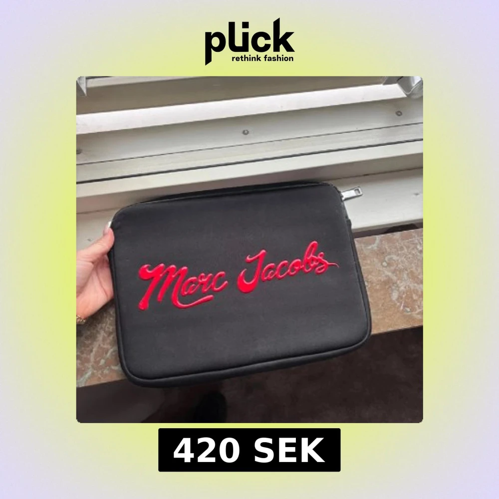 Perfekt till skolstarten! Svart datorväska från Marc Jacobs med coolt rött logotyptryck på framsidan och diskret vit text på baksidan. Väskan har en mjuk, rektangulär form och dragkedja upptill. Perfekt för att bära din laptop med stil.