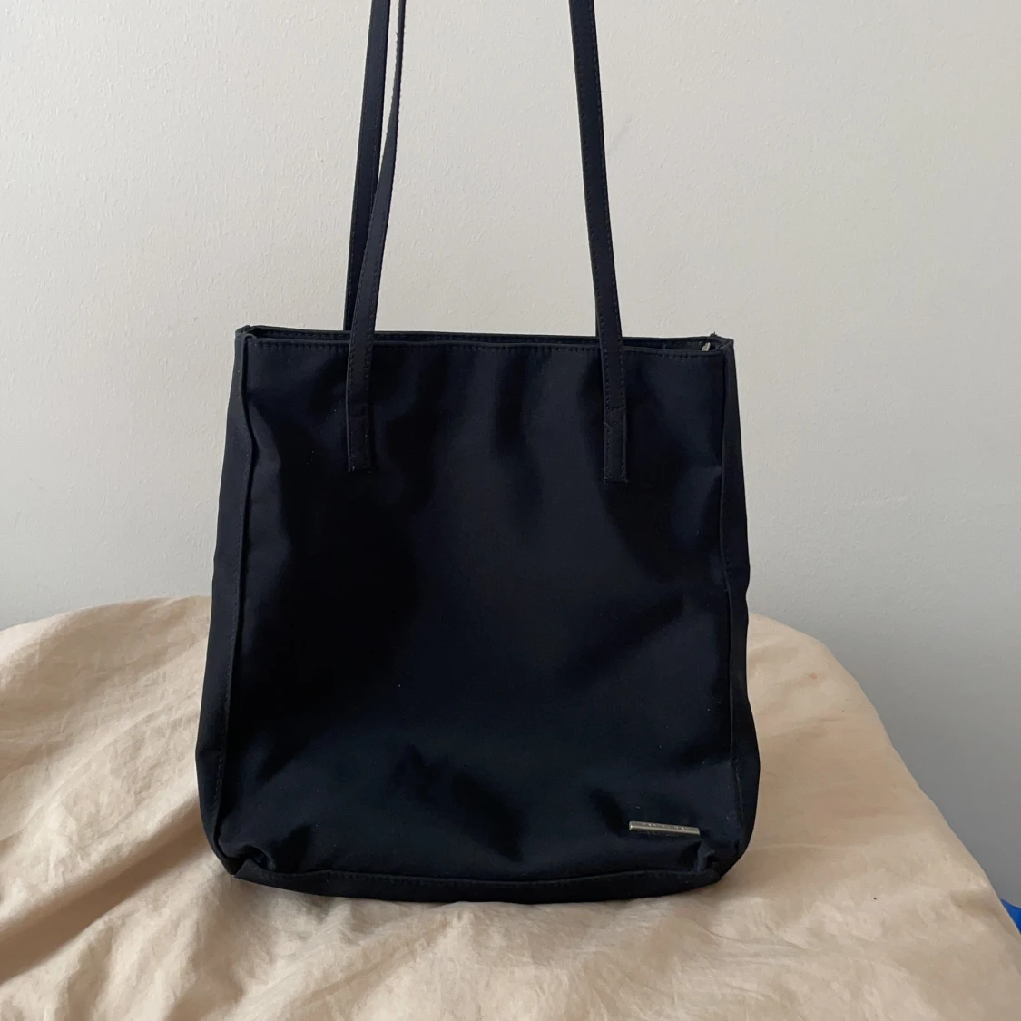 Medel stor axelväska i matt svart tygg. En ficka på baksidan och en i, båda med dragkedja